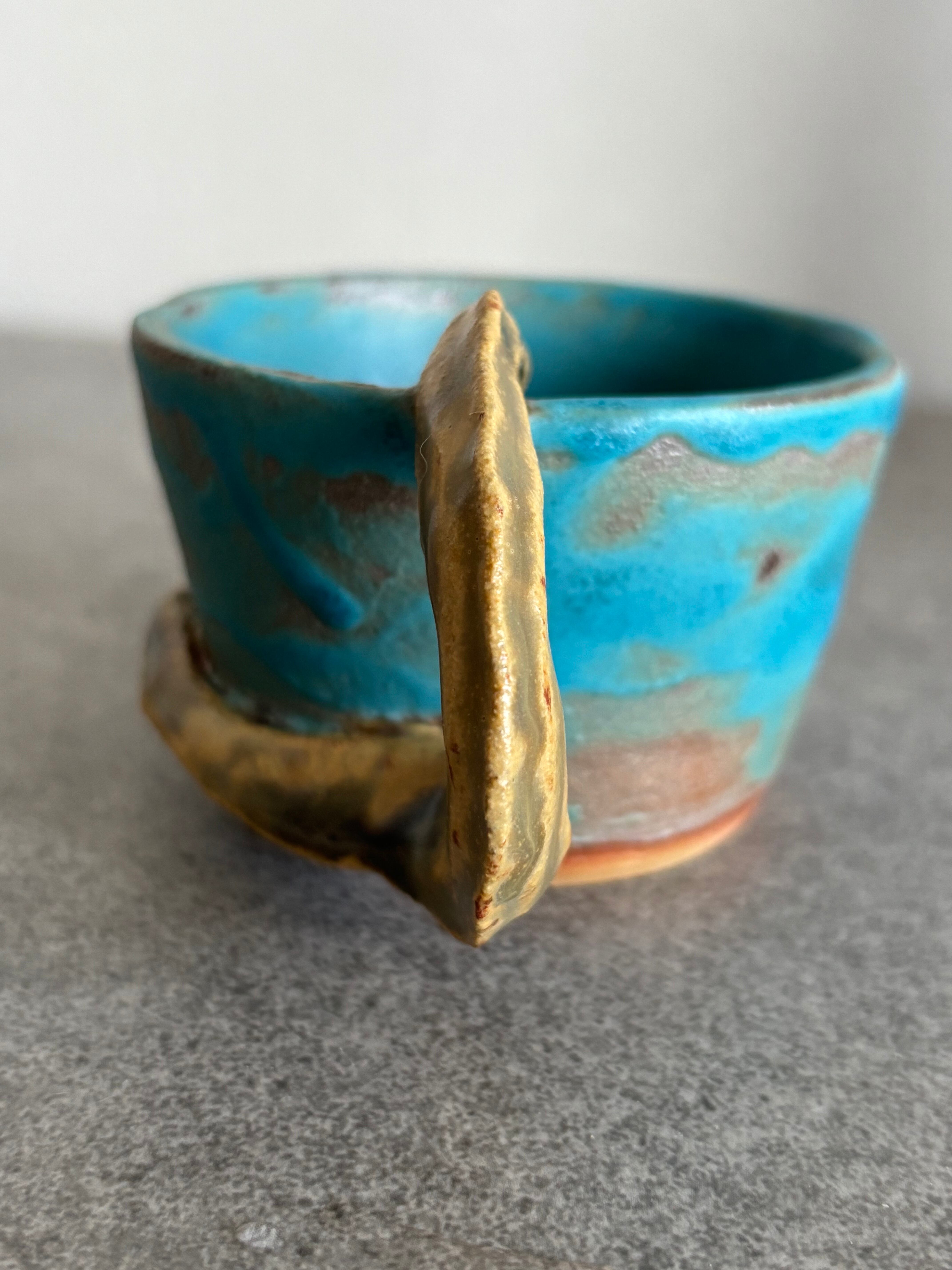 海の生き物シリーズのウツボが取っ手の小ぶりなコーヒーカップ、デミタスカップです。釉薬垂れのハワイアンブルーの釉薬が、海の中にいるウツボを想像させます。ウツボ好きの方にはたまらないデザインで、日常のコーヒータイムを楽しんで下さい。