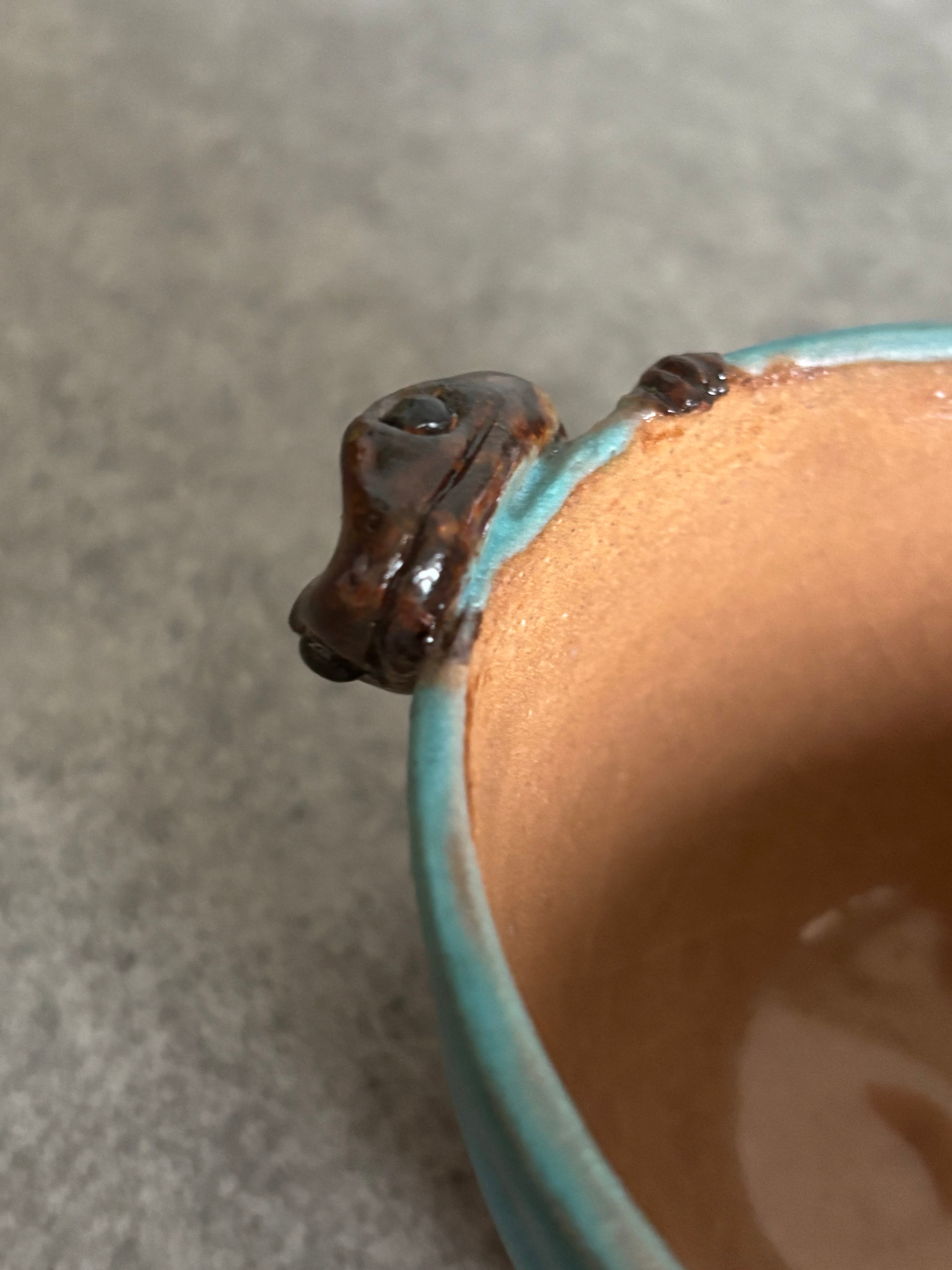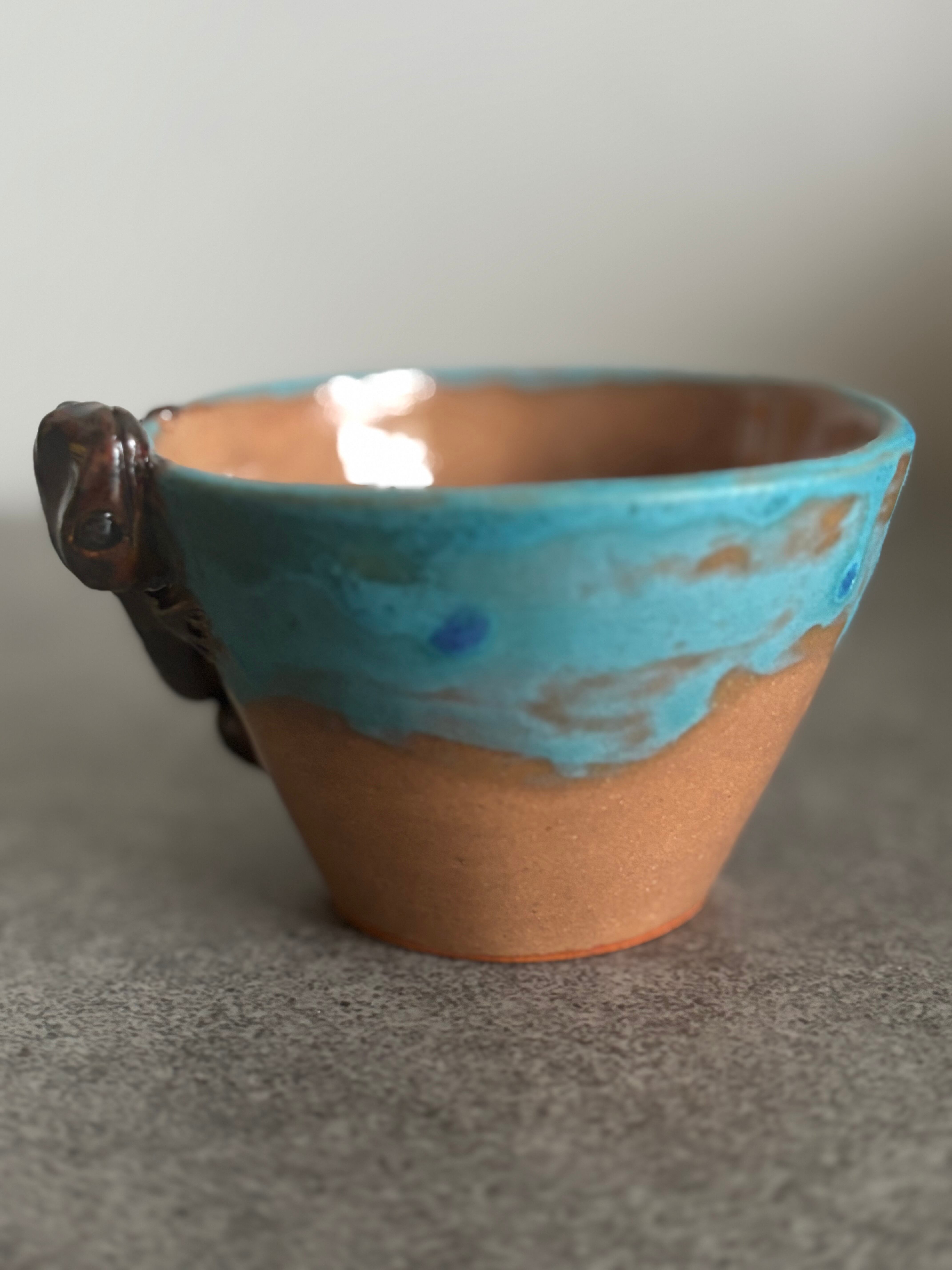 生き物シリーズのアオジタトカゲモチーフのフリーカップ、ぐい呑みです。ハワイアンブルーの釉薬垂れとトカゲ好きの方にはたまらないデザインで、コーヒータイムやお酒の時間を楽しんで下さい。