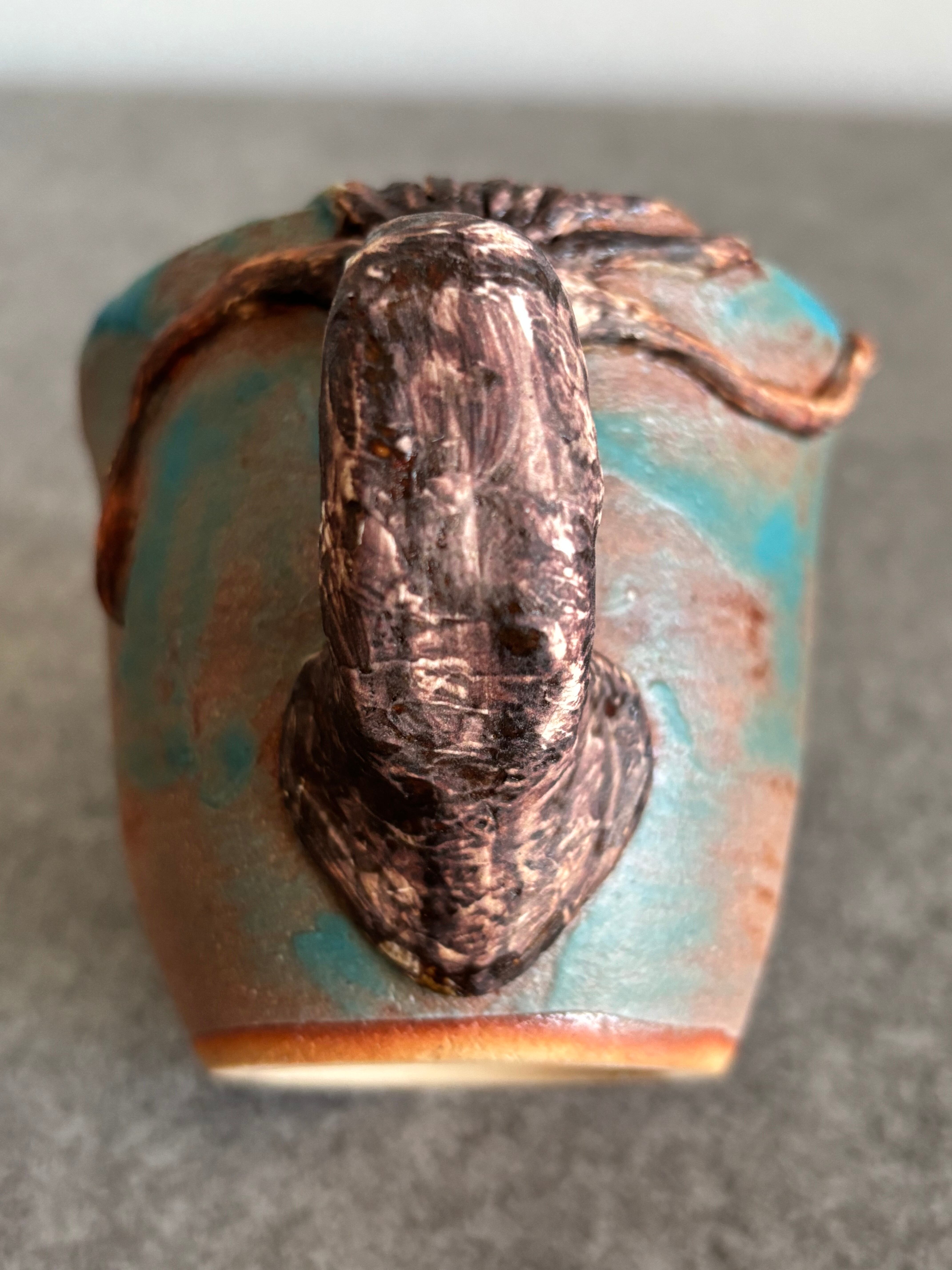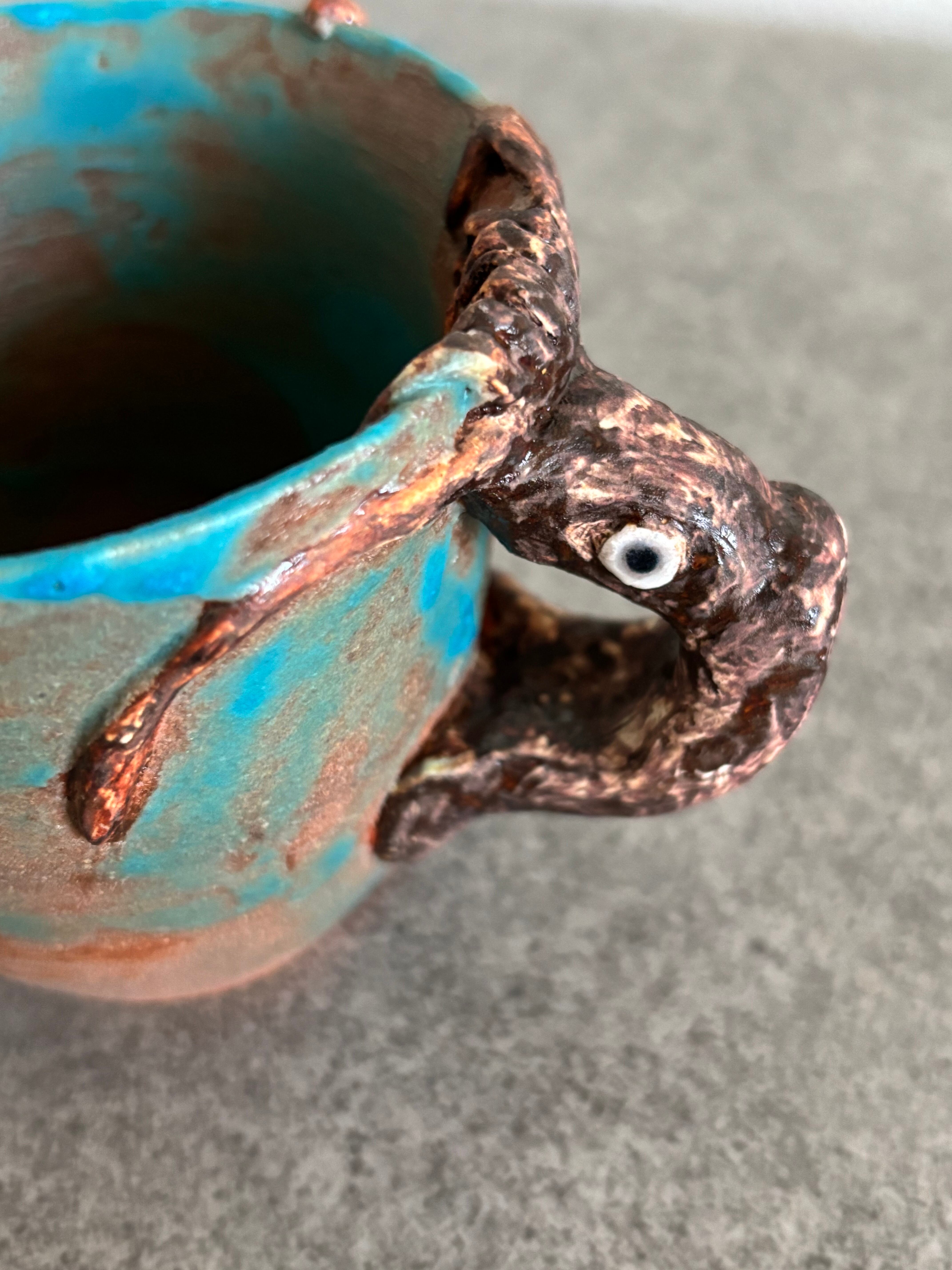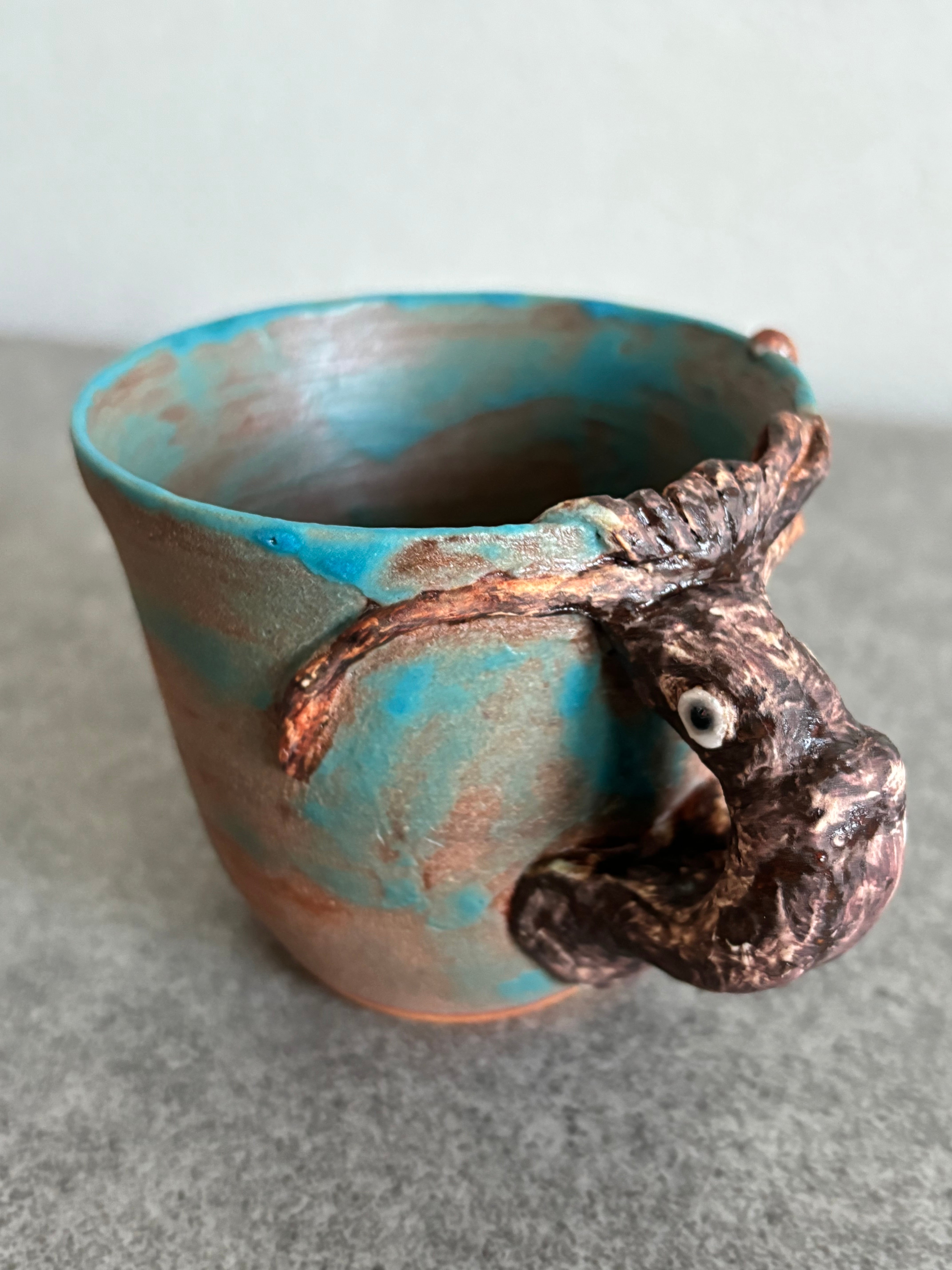 海の生き物シリーズ、リアルなイカが取っ手のコーヒーカップです。釉薬垂れのハワイアンブルーの釉薬が、海の中にいるイカを想像させます。イカ好きの方にはたまらないデザインで、日常のコーヒータイムを楽しんで下さい。