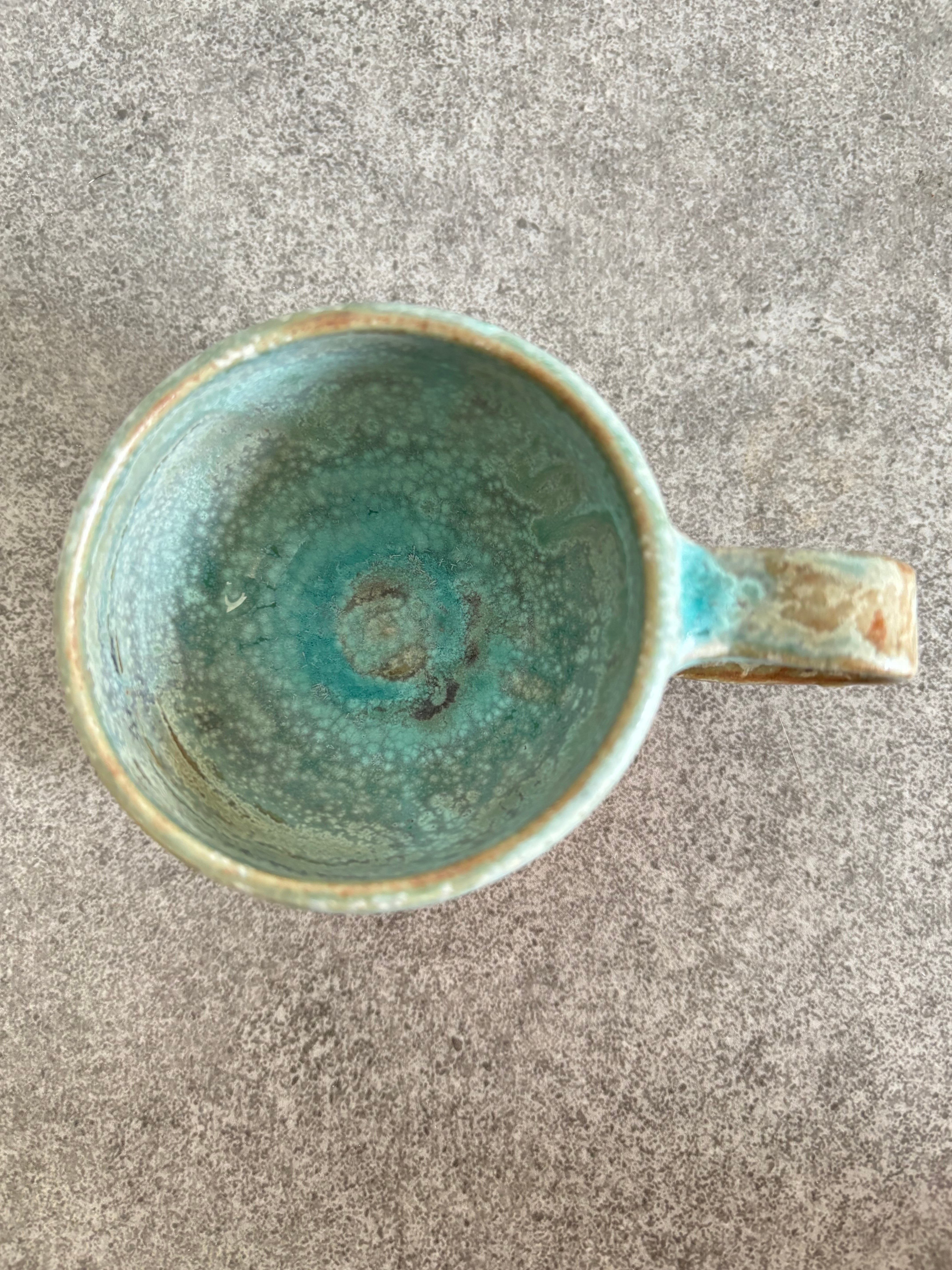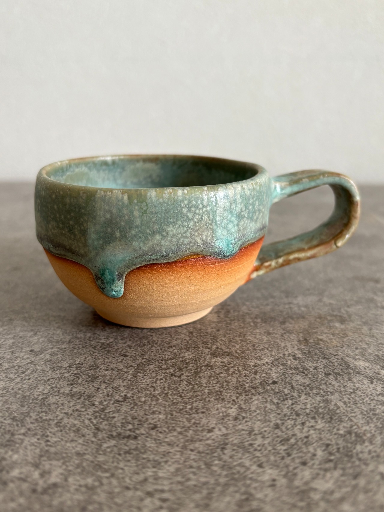 海をテーマにしたエメラルドグリーンの色合いが特徴の小ぶりな丸い形状のコーヒーカップです。釉薬垂れの海の雫が滴り落ちるようなデザインが、まるで海の波のように優雅に流れ、アートとしての魅力を感じていただけます。エスプレッソ等のデミタスカップとして最適で、毎日のコーヒータイムを特別なひとときにしてくれます。