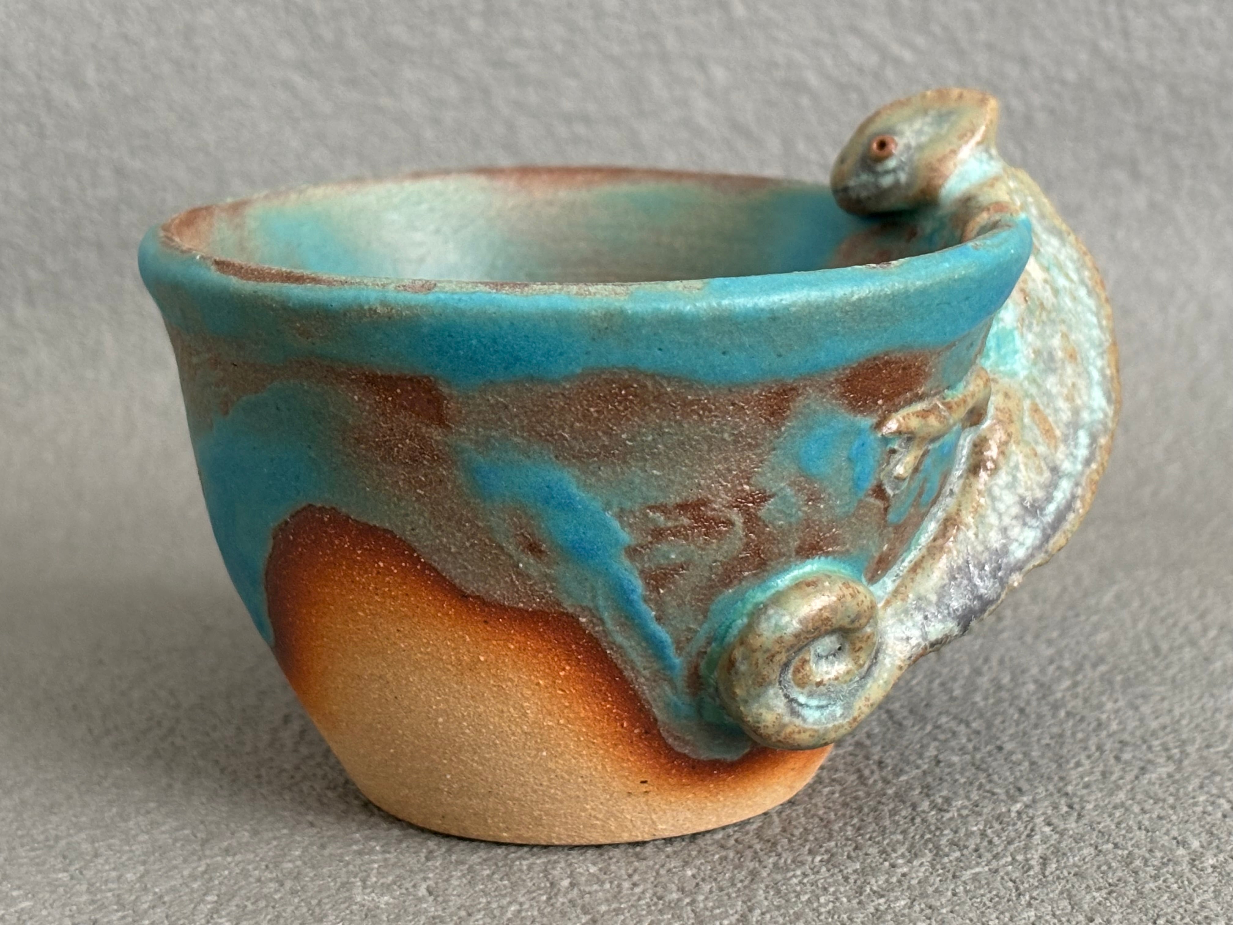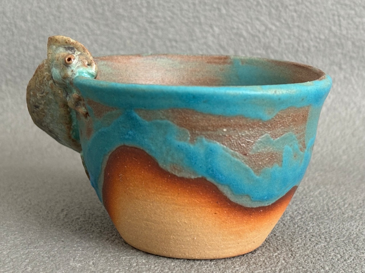 生き物シリーズのカメレオンモチーフのコーヒーカップです。釉薬垂れのハワイアンブルーの釉薬のカメレオン好きの方にはたまらないデザインで、日常のコーヒータイムを楽しんで下さい。