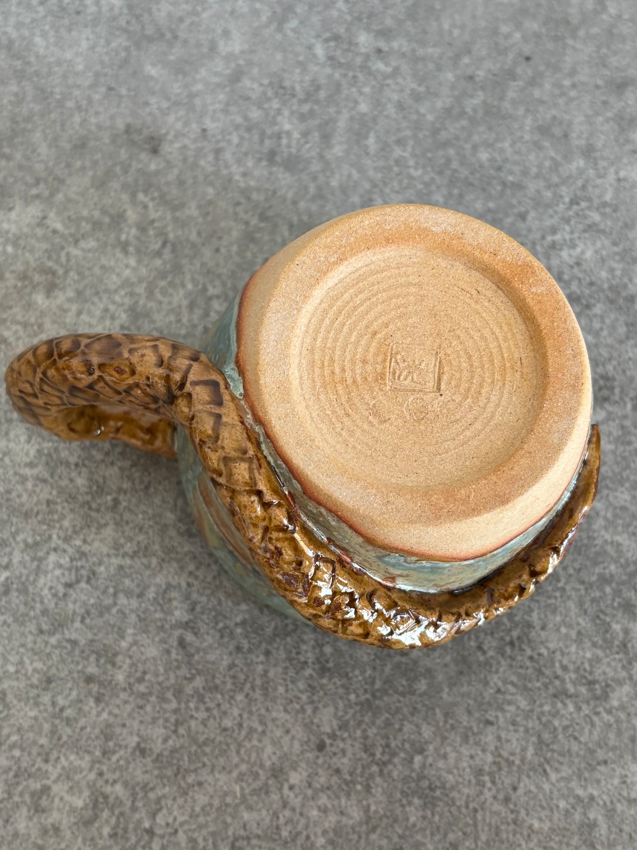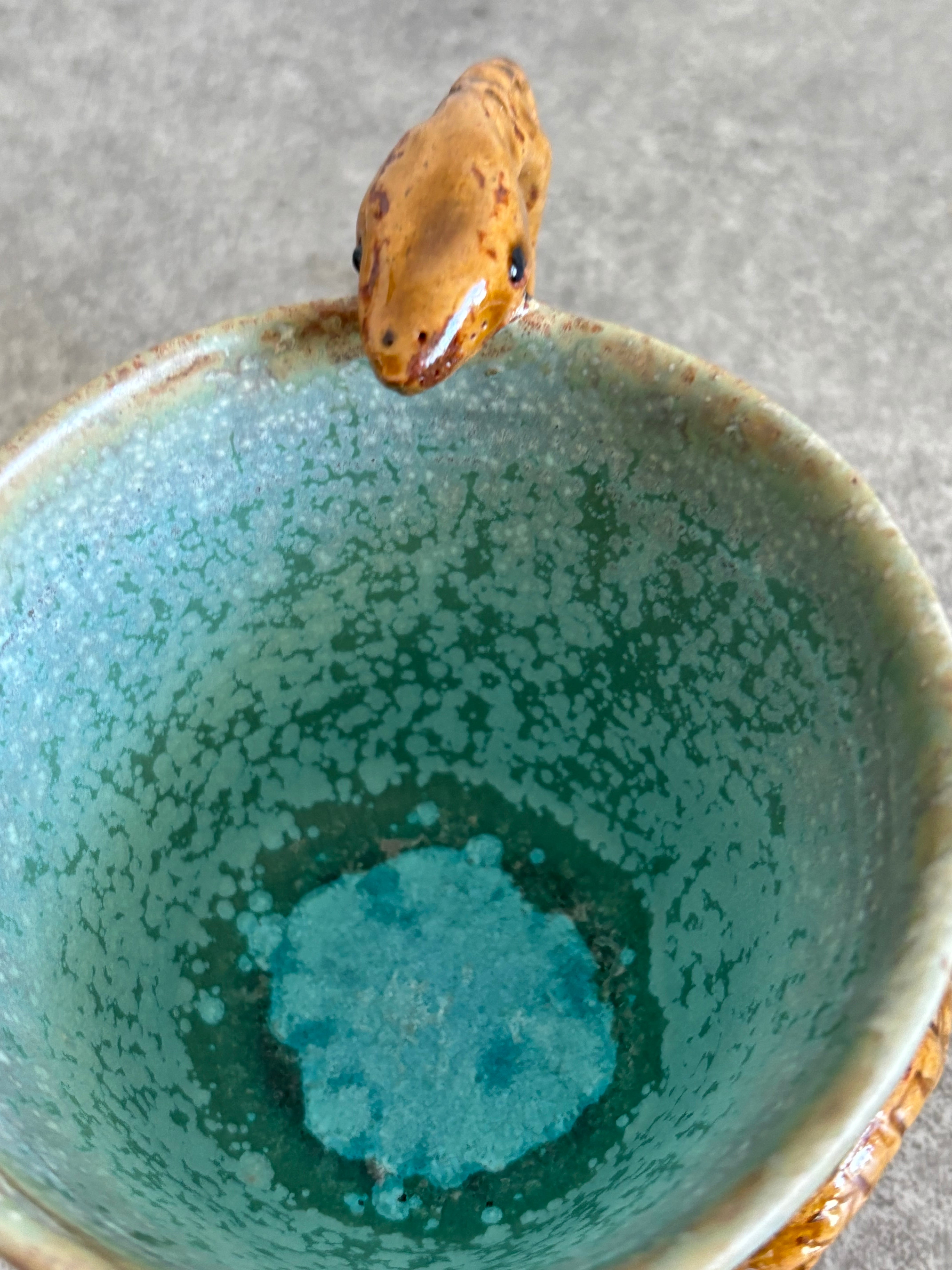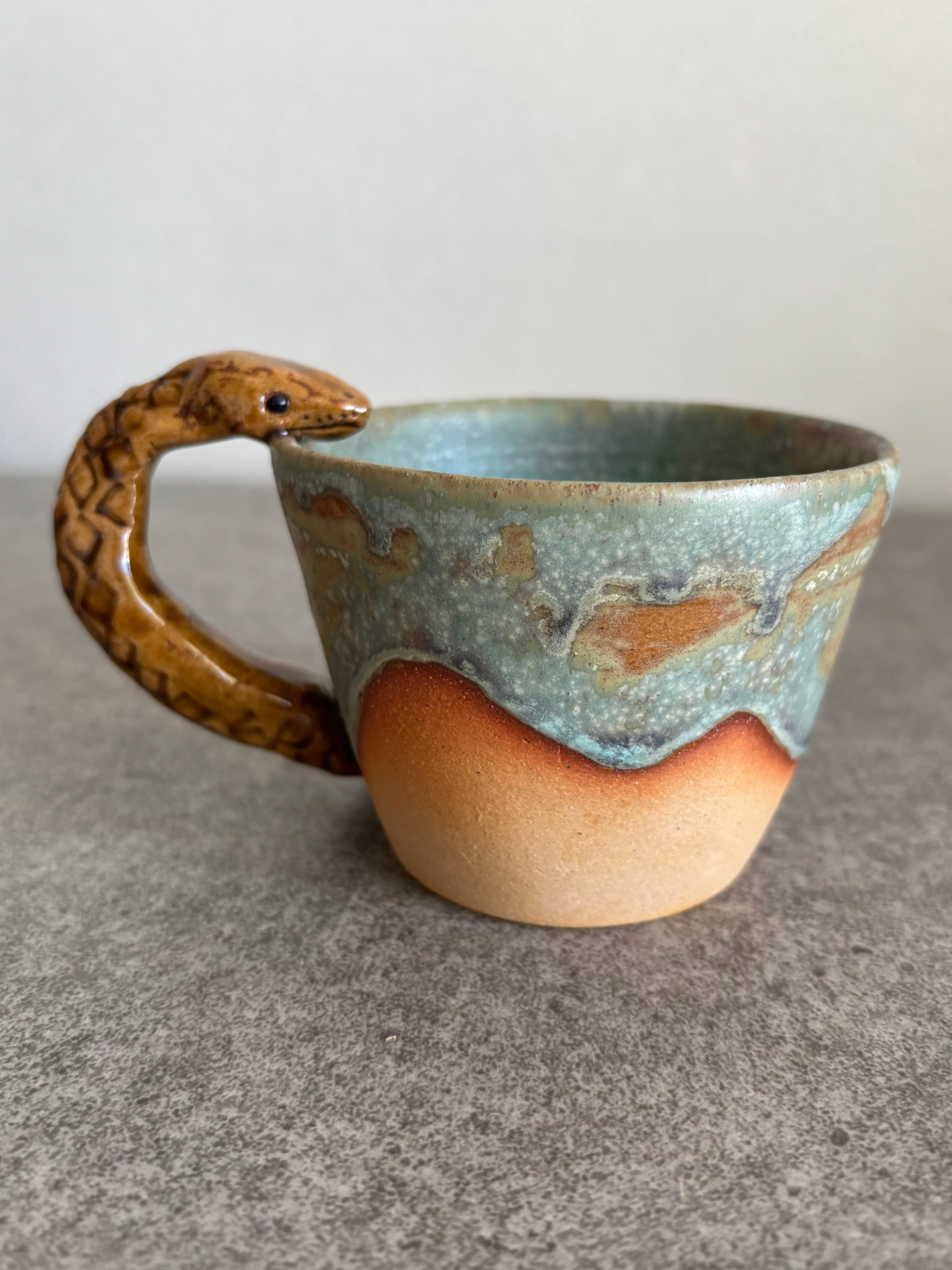 生き物シリーズの蛇が取っ手になったコーヒーカップです。釉薬垂れのエメラルドグリーンの釉薬と、ヘビ好きの方にはたまらないデザインで、日常のコーヒータイムを楽しんで下さい。