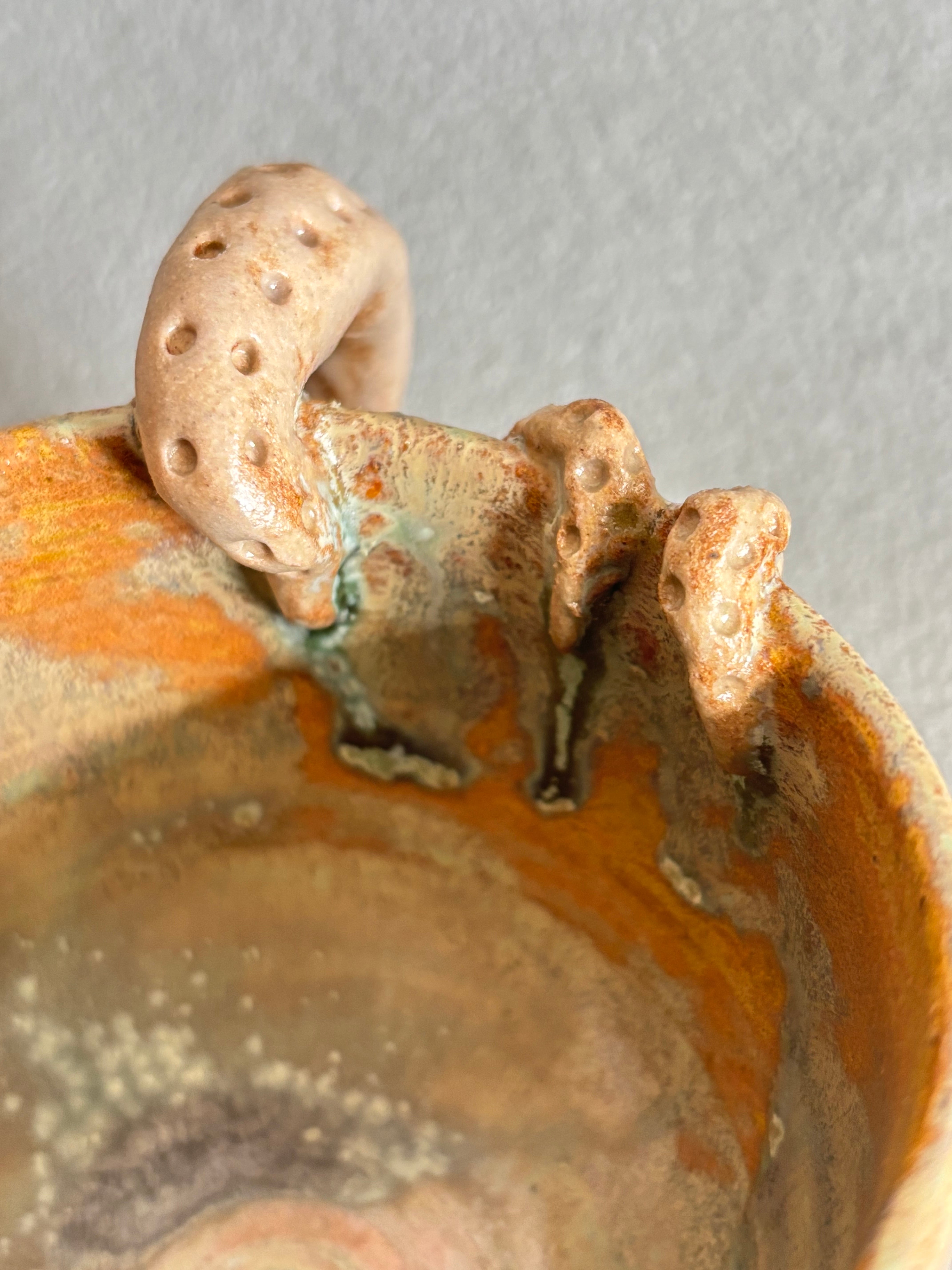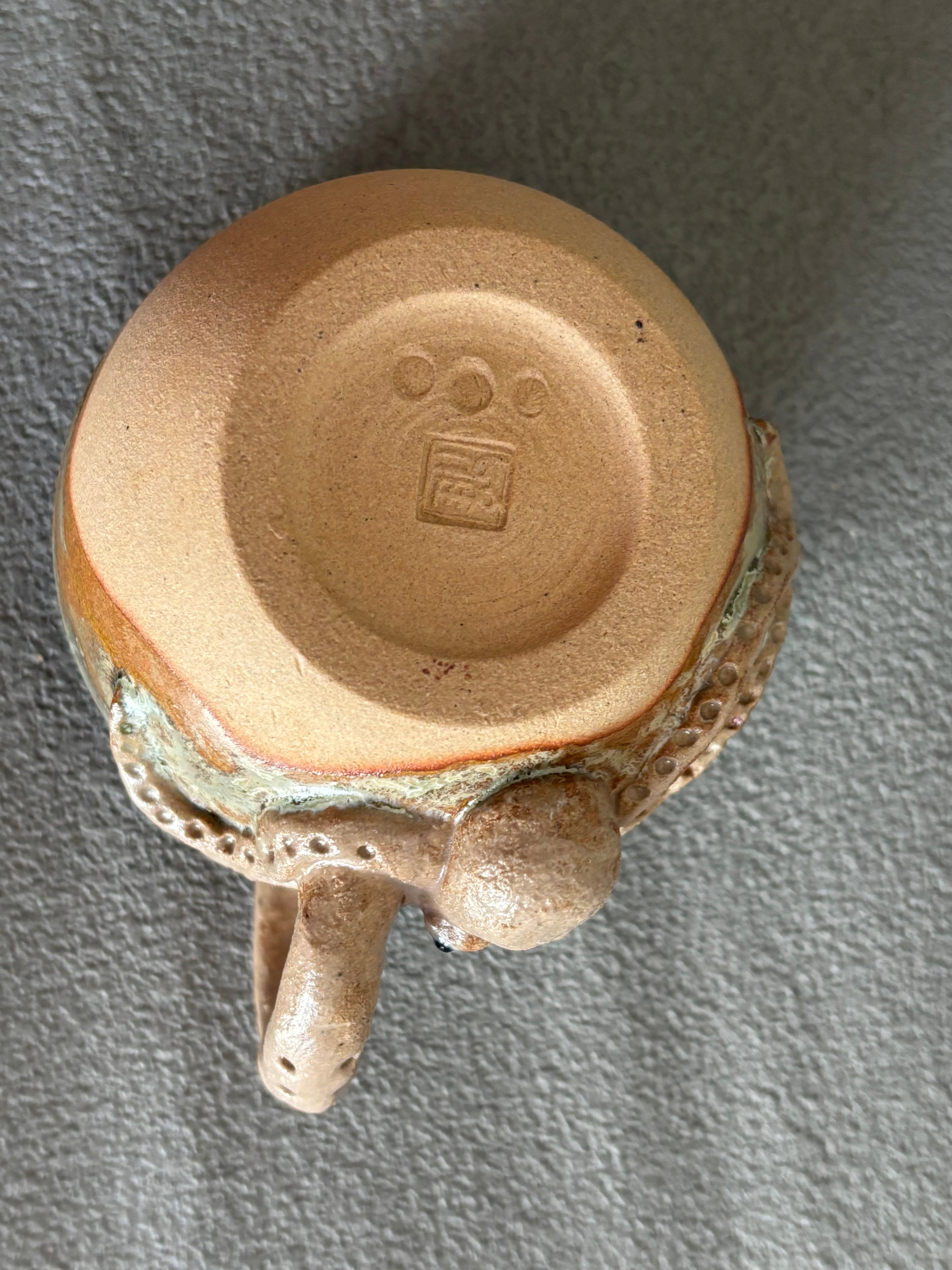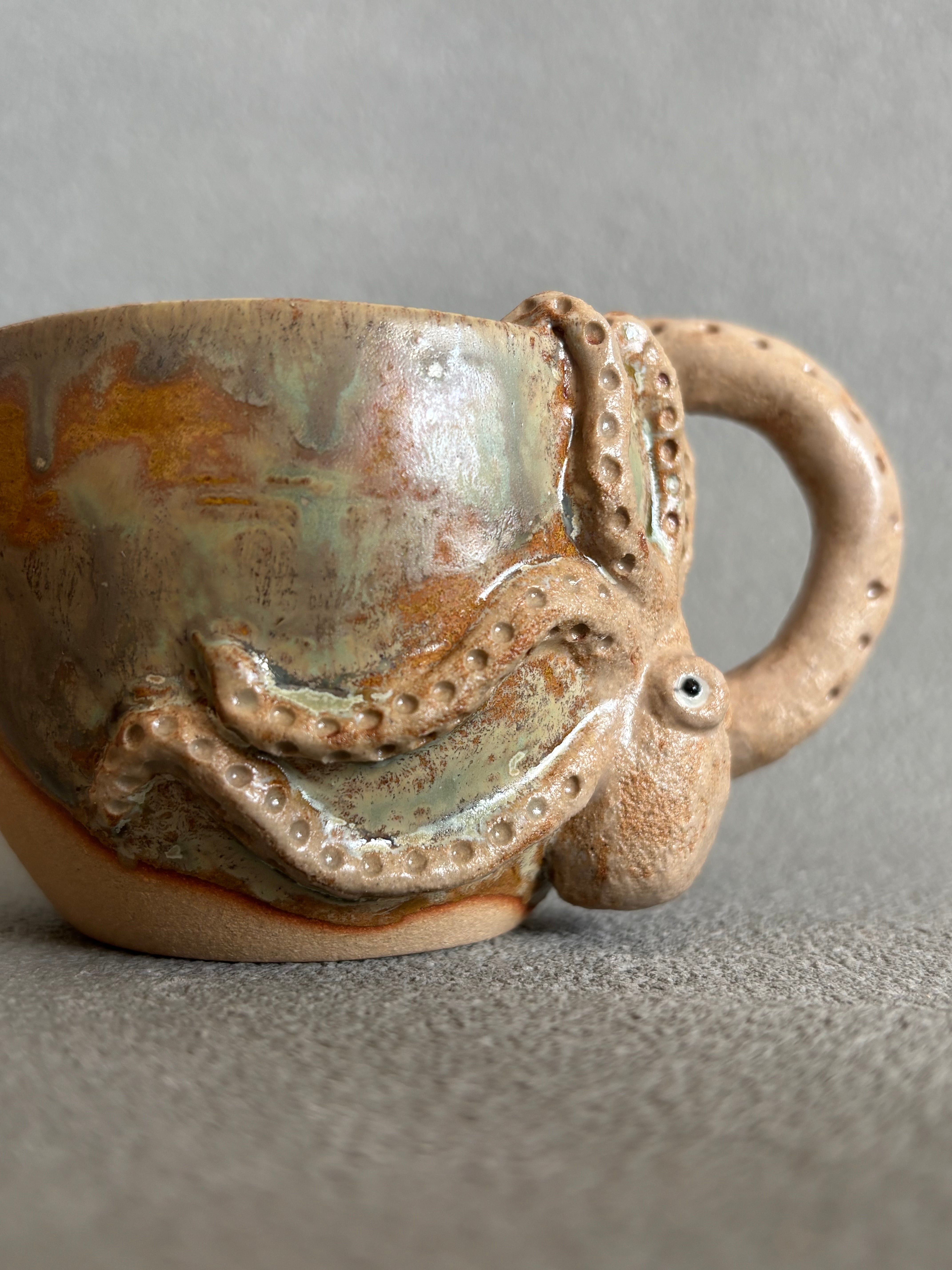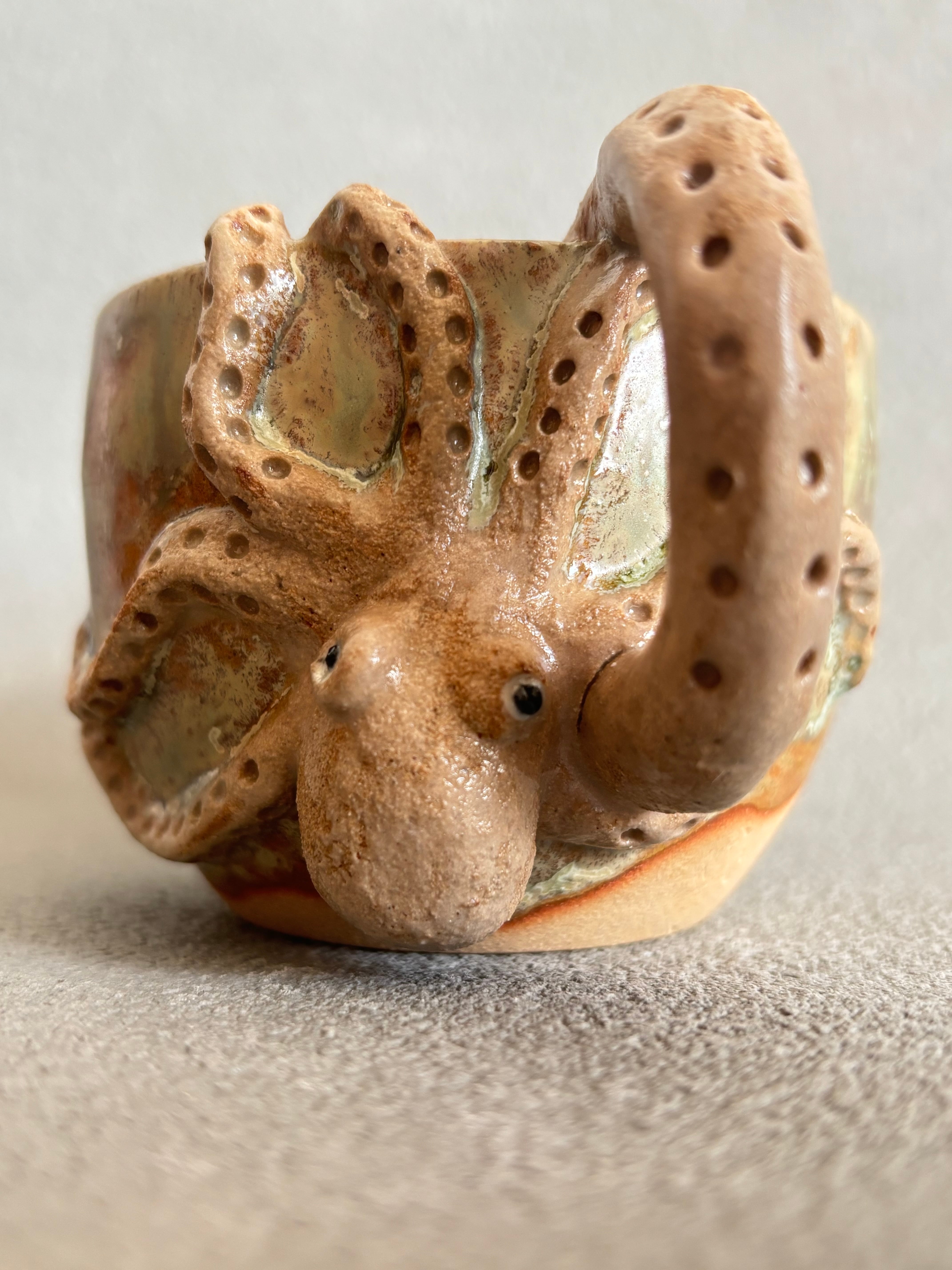 海の生き物シリーズ、リアルなタコがモチーフで、国芳タコがイメージの脚が取っ手のコーヒーカップです。釉薬垂れのエメラルドグリーンの釉薬が、海の中にいるタコを想像させます。タコ好きの方にはたまらないデザインで、日常のコーヒータイムを楽しんで下さい。