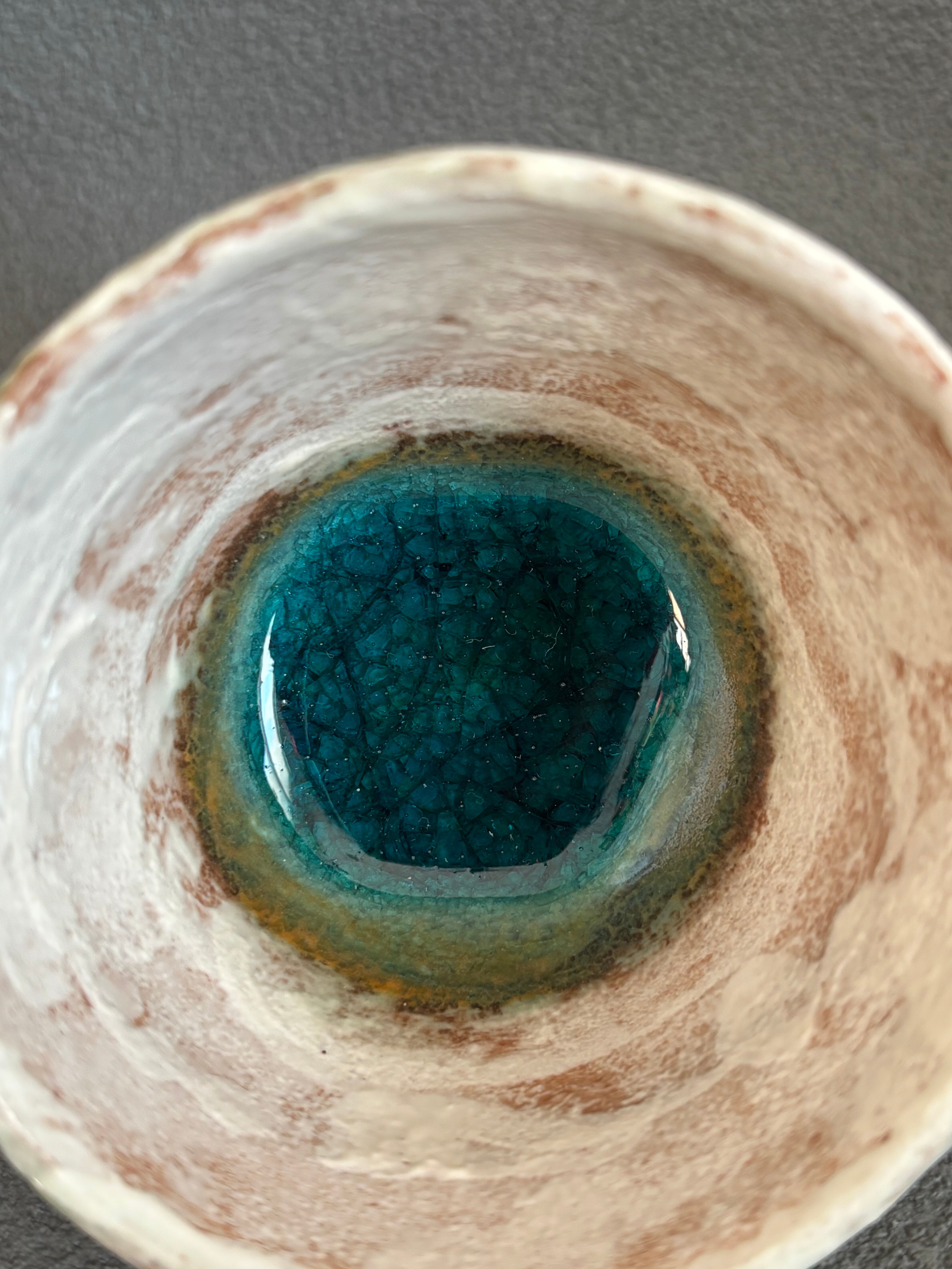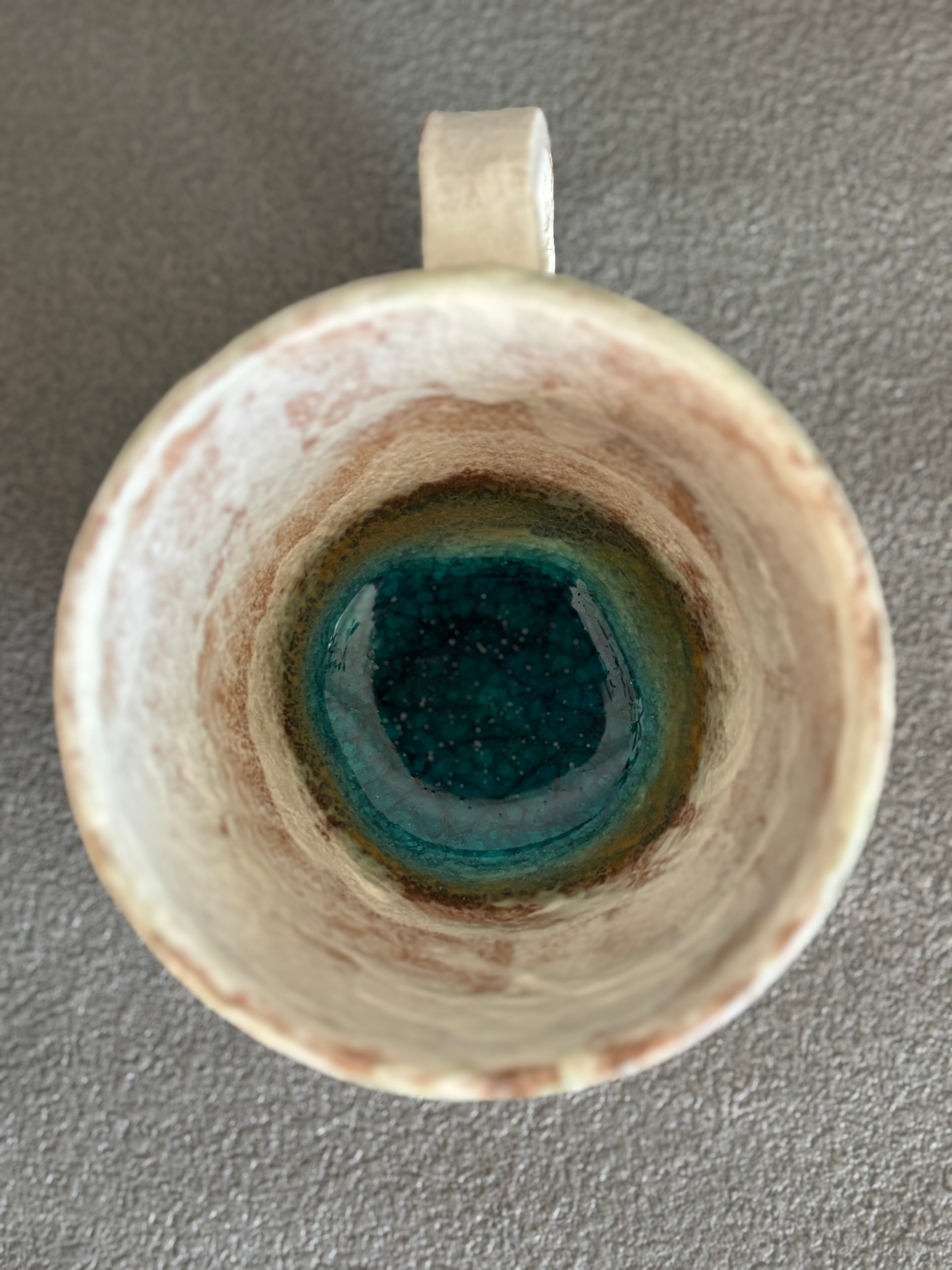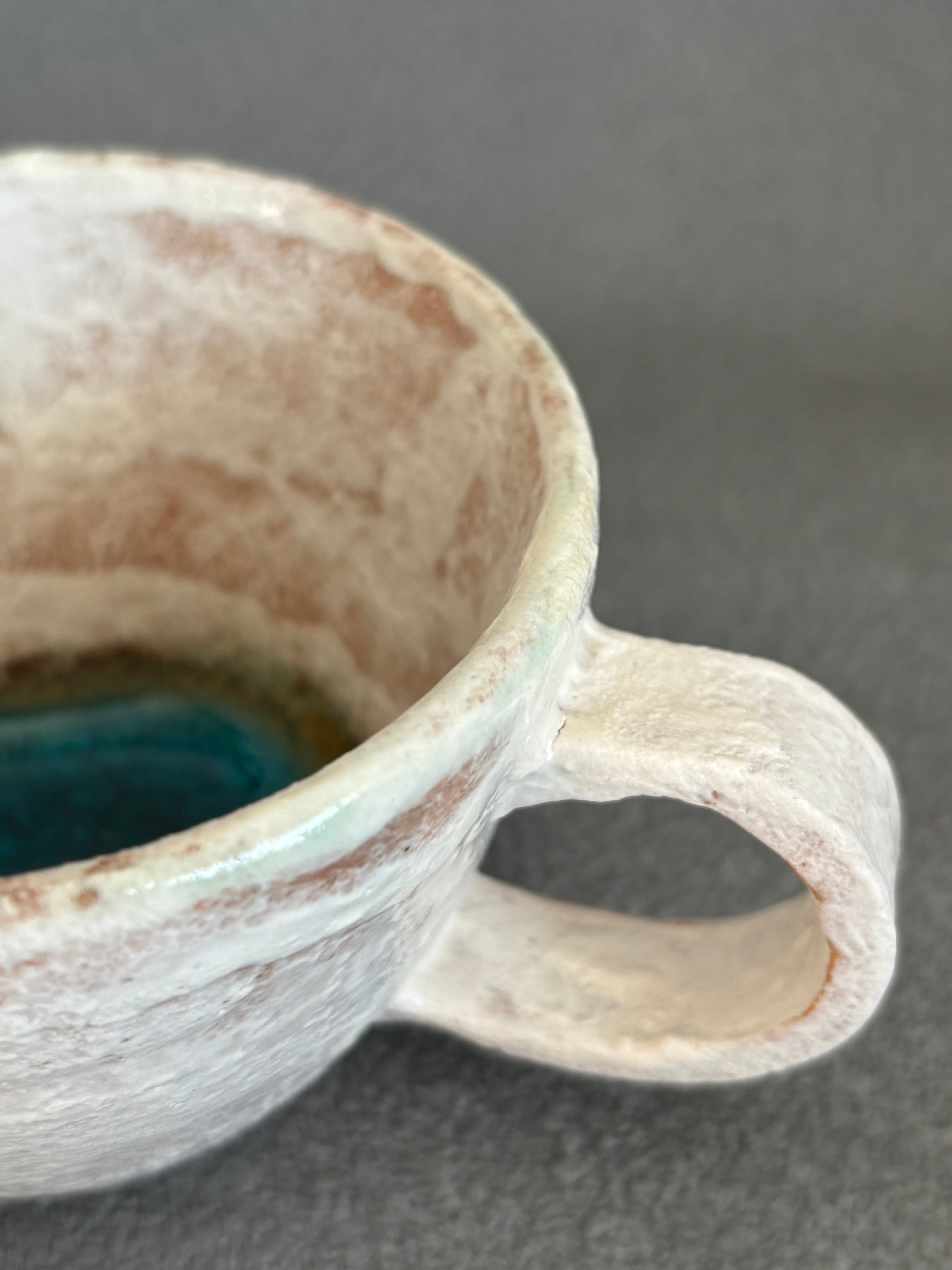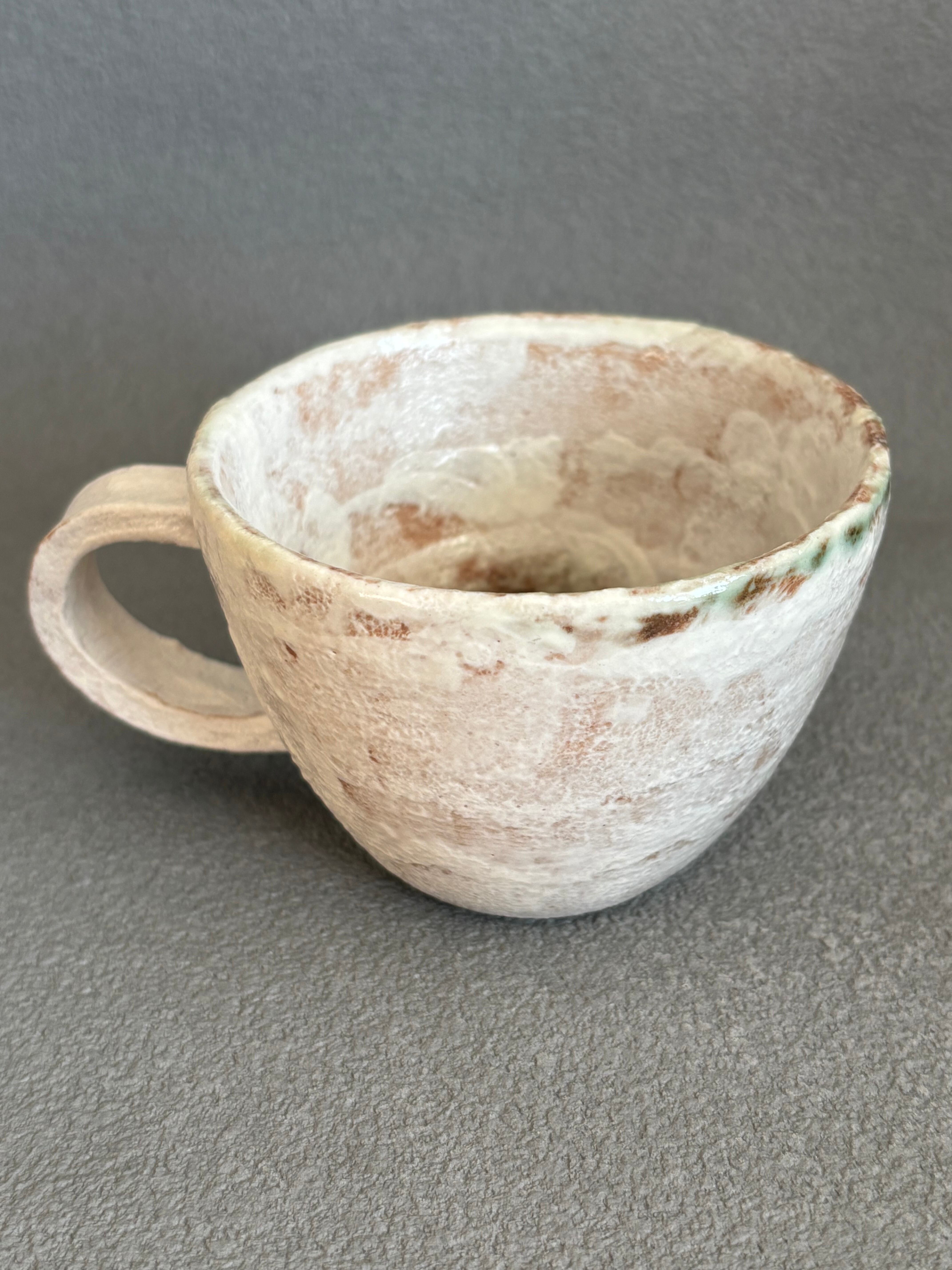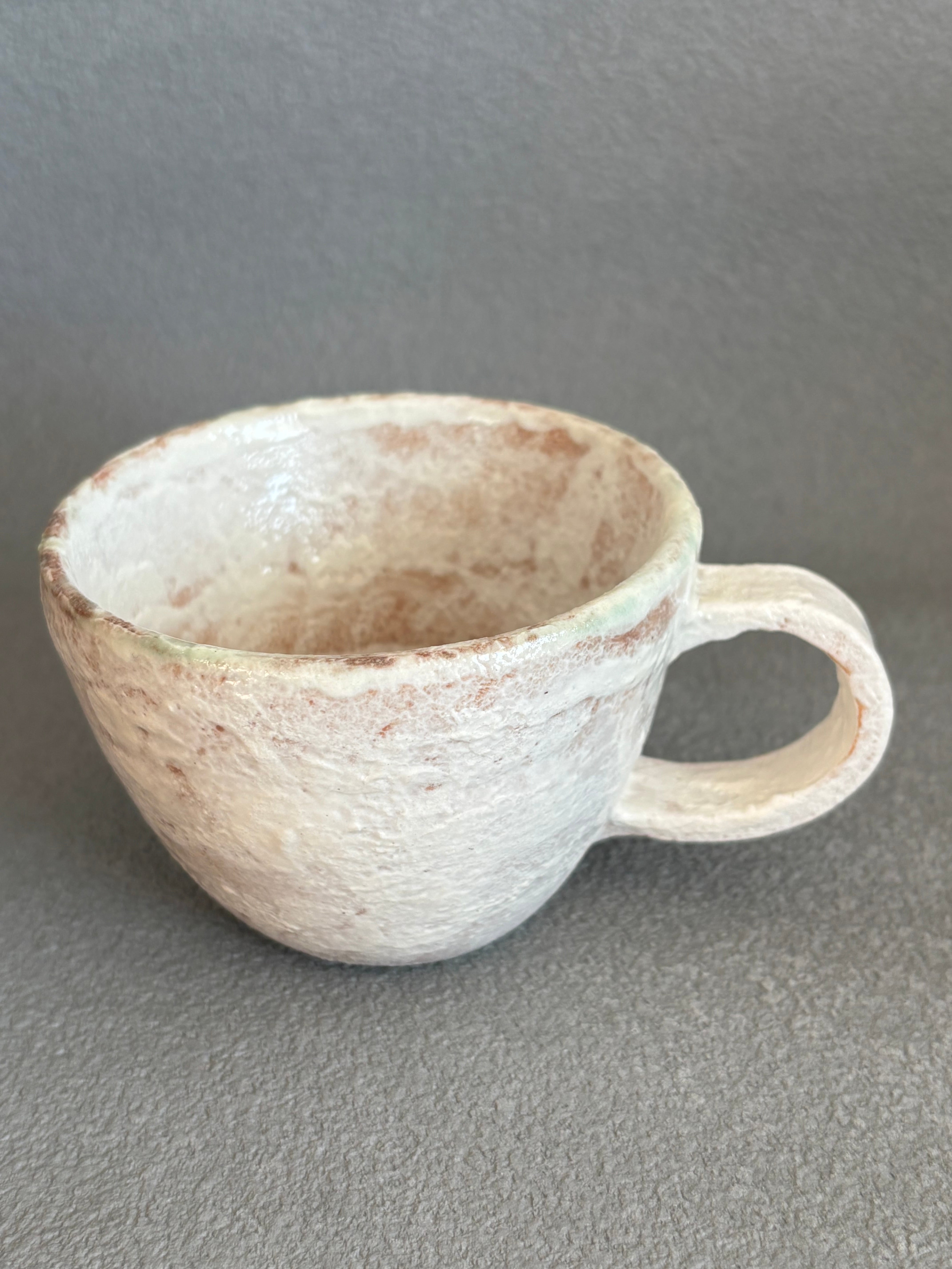白い砂浜をテーマにした白化粧と底に溜まったエメラルドグリーンの釉薬が特徴のきれいなコーヒーカップです。毎日のコーヒータイムを特別なひとときにしてくれます。