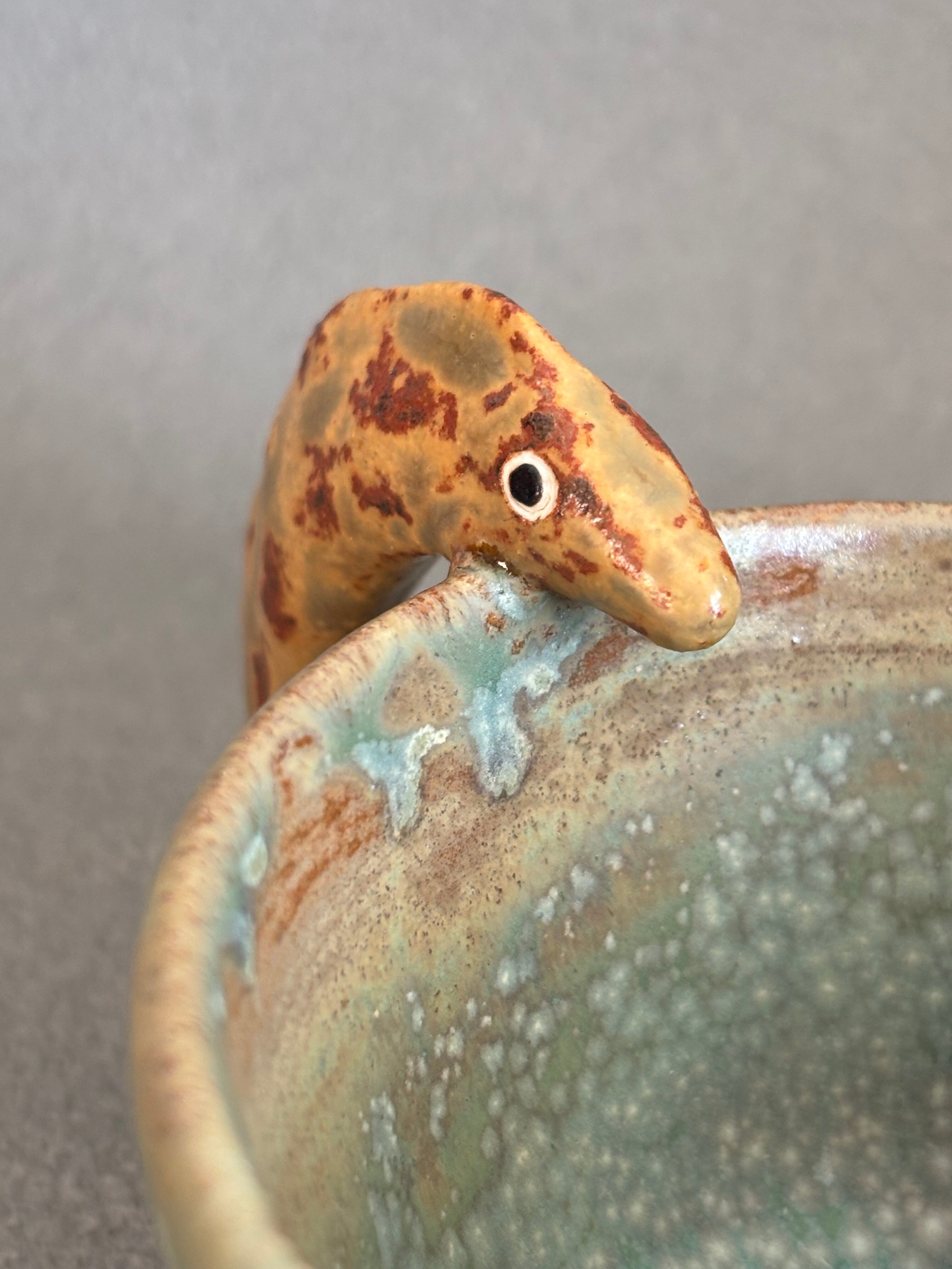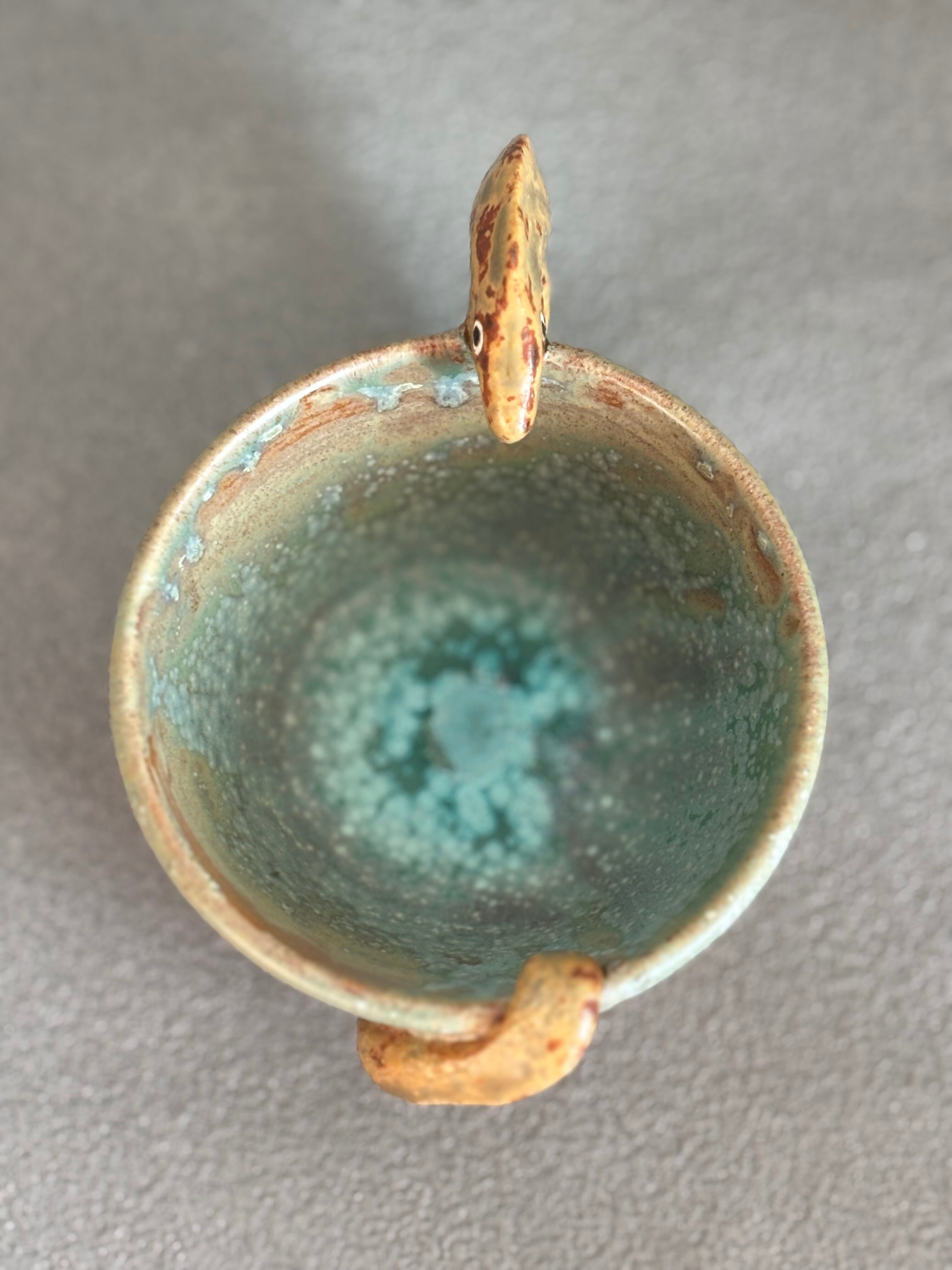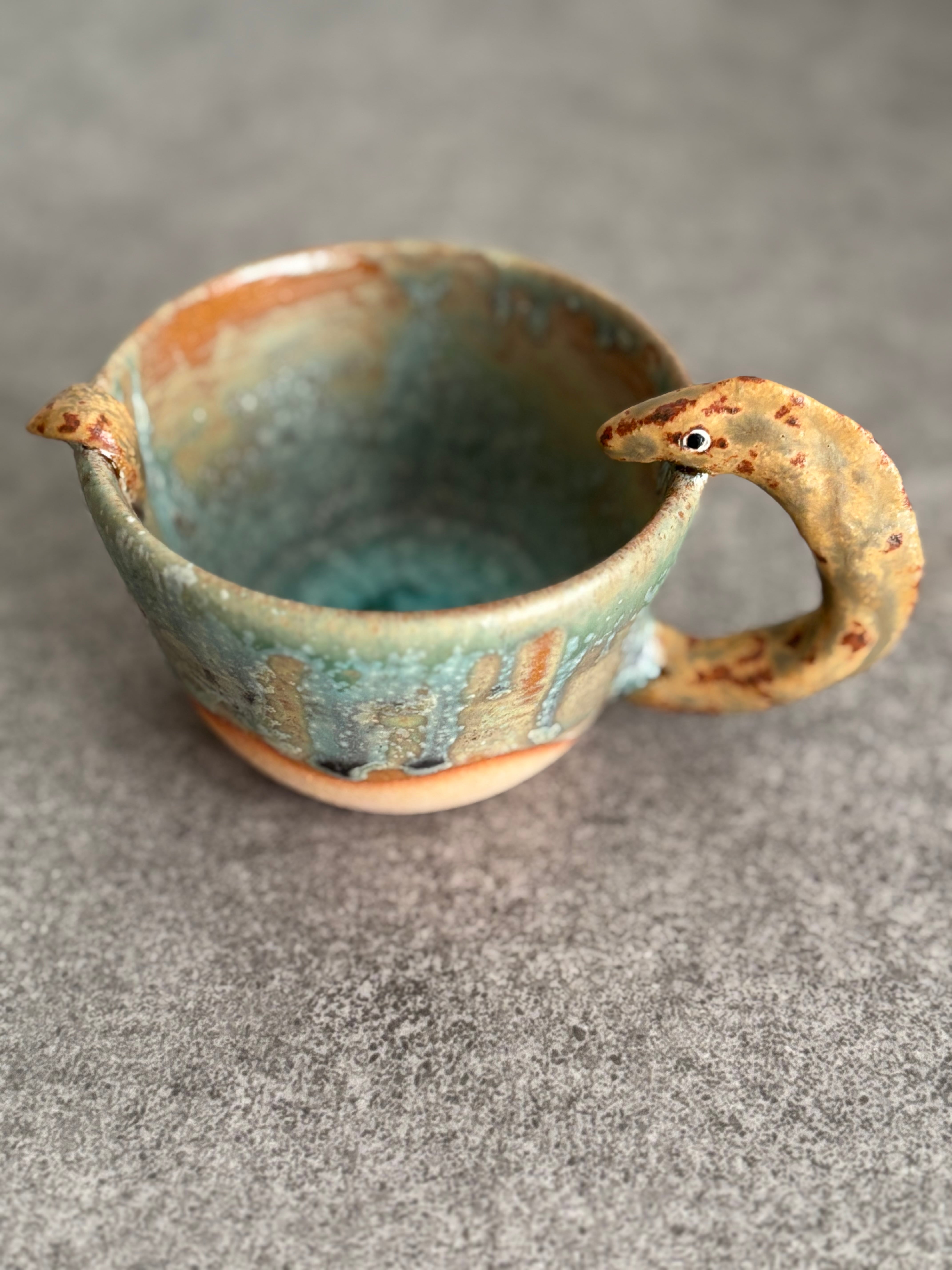 海の生き物シリーズのウツボが取っ手の小ぶりなコーヒーカップです。釉薬垂れのエメラルドグリーンの釉薬が、海の中にいるウツボを想像させます。ウツボ好きの方にはたまらないデザインで、日常のコーヒータイムを楽しんで下さい。