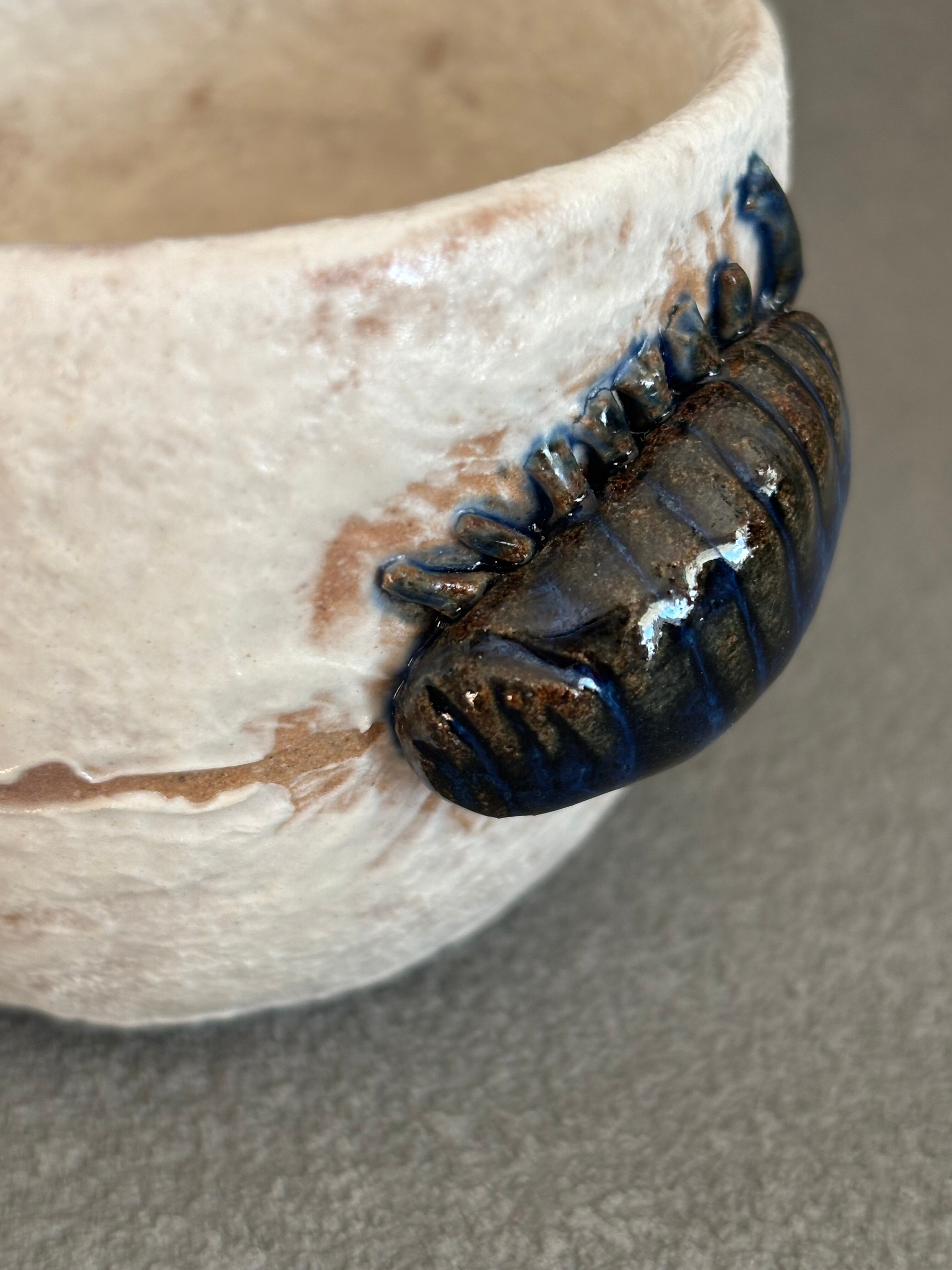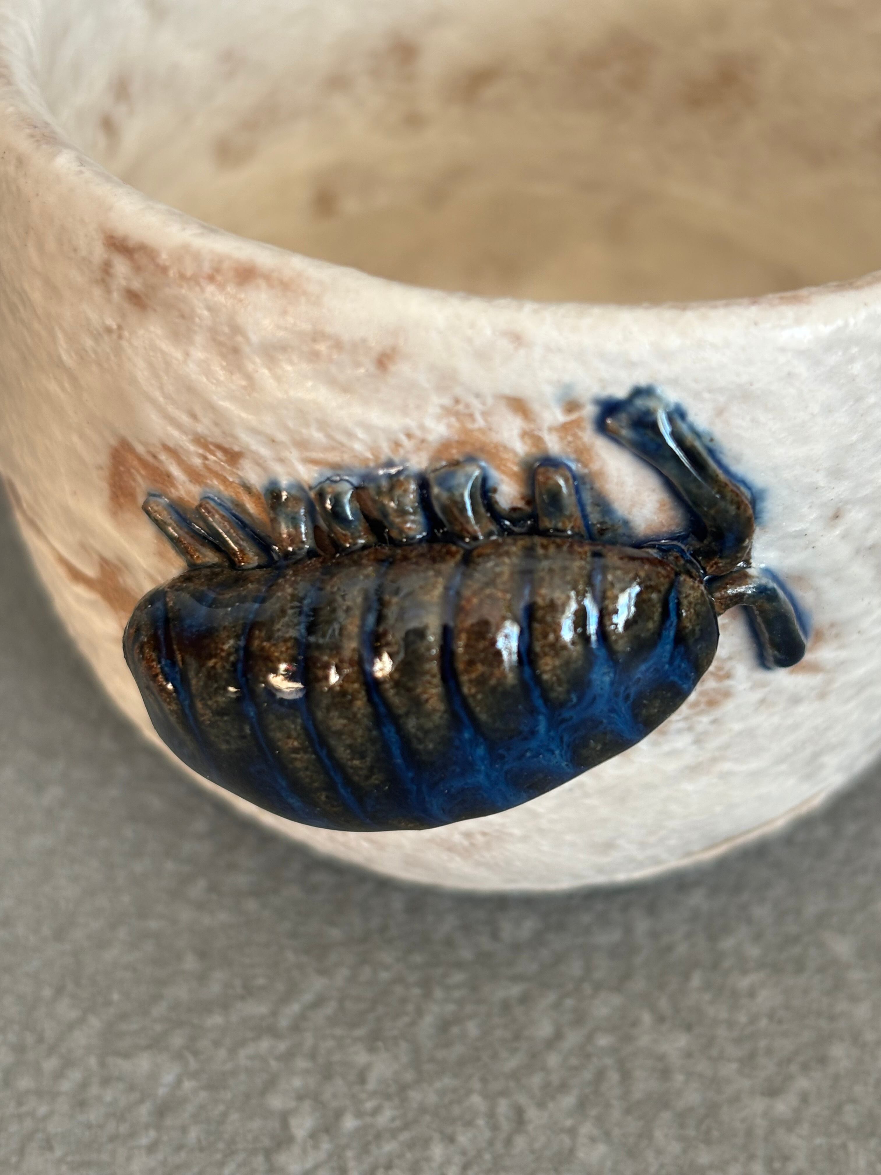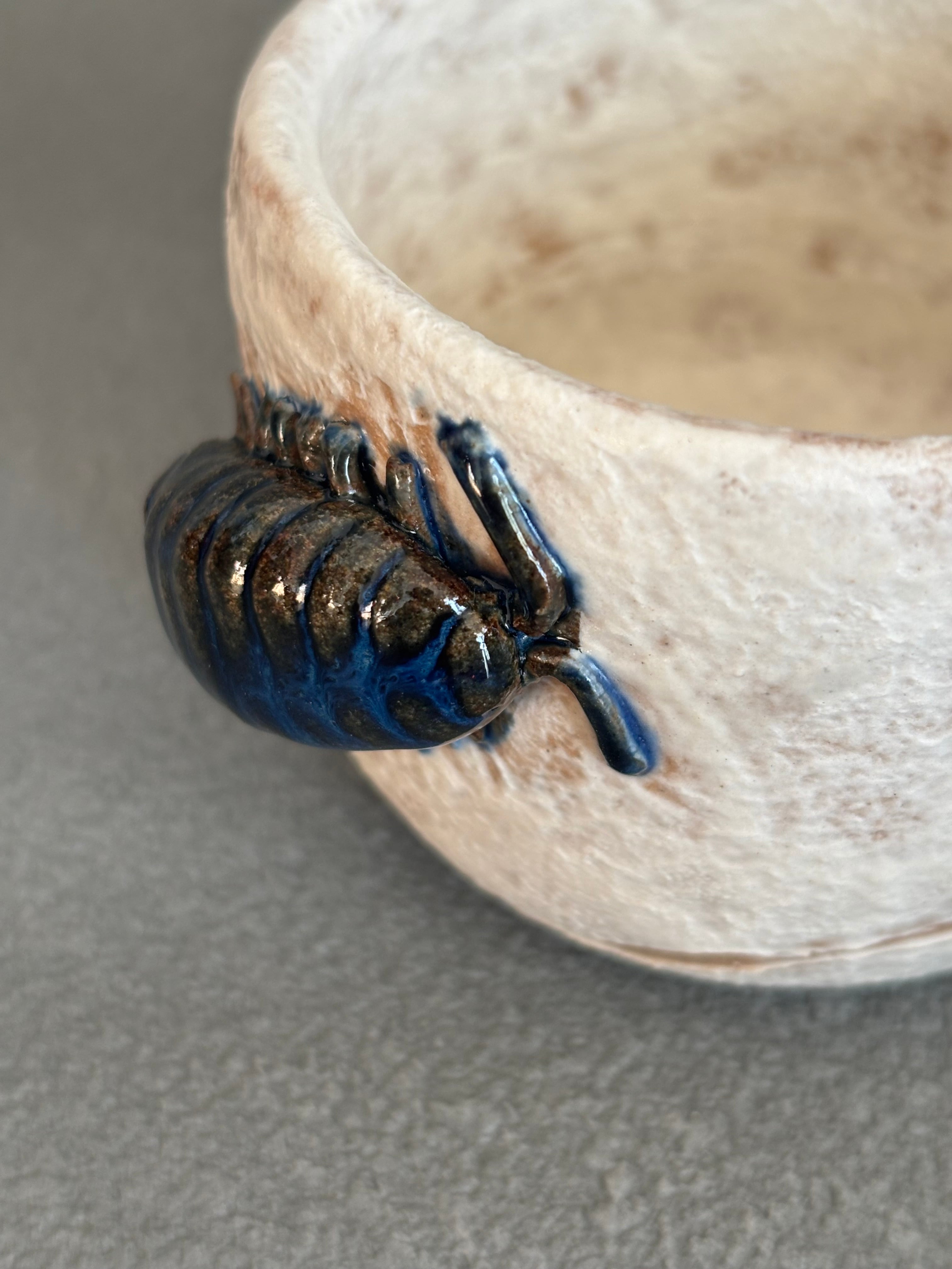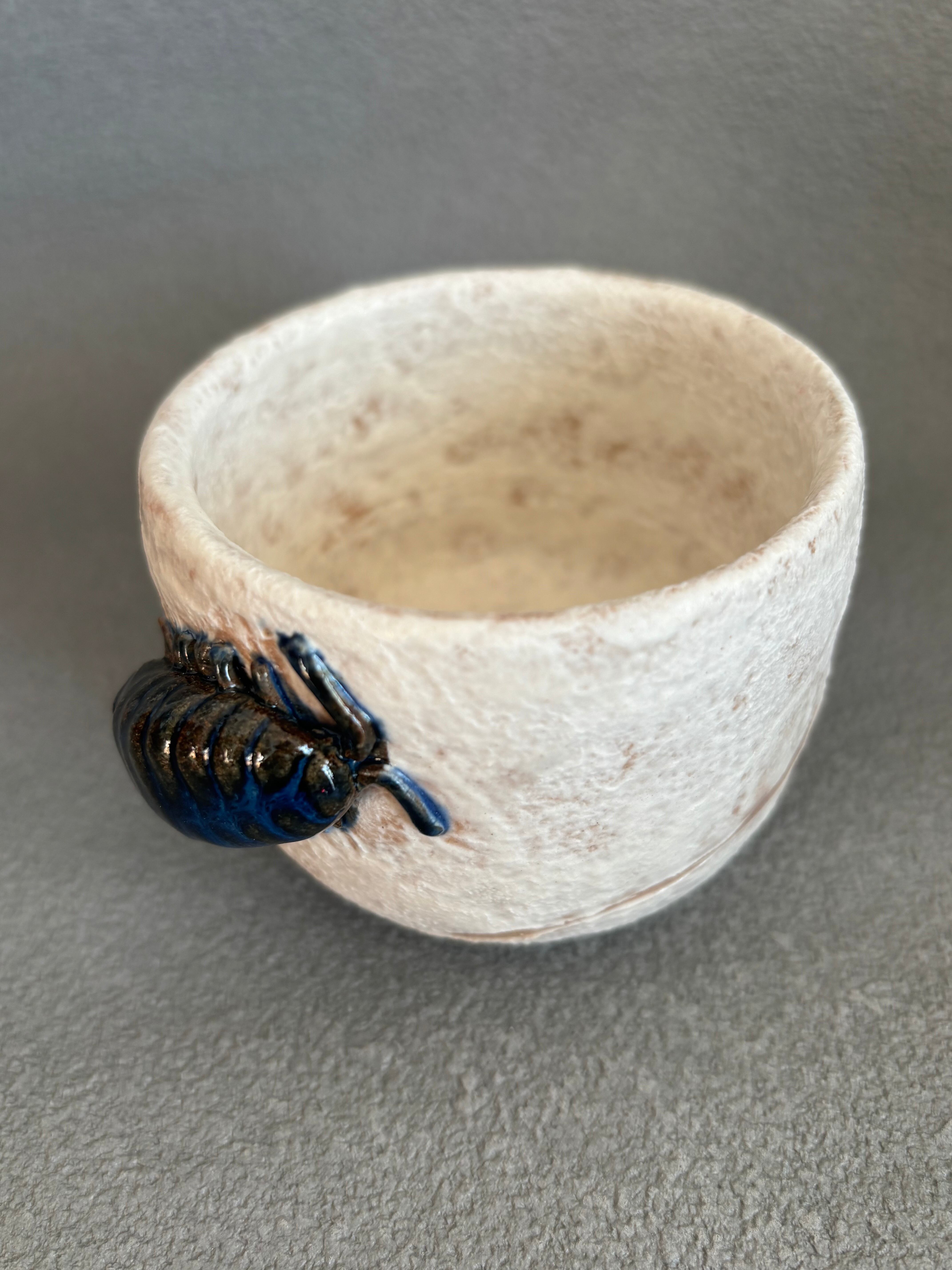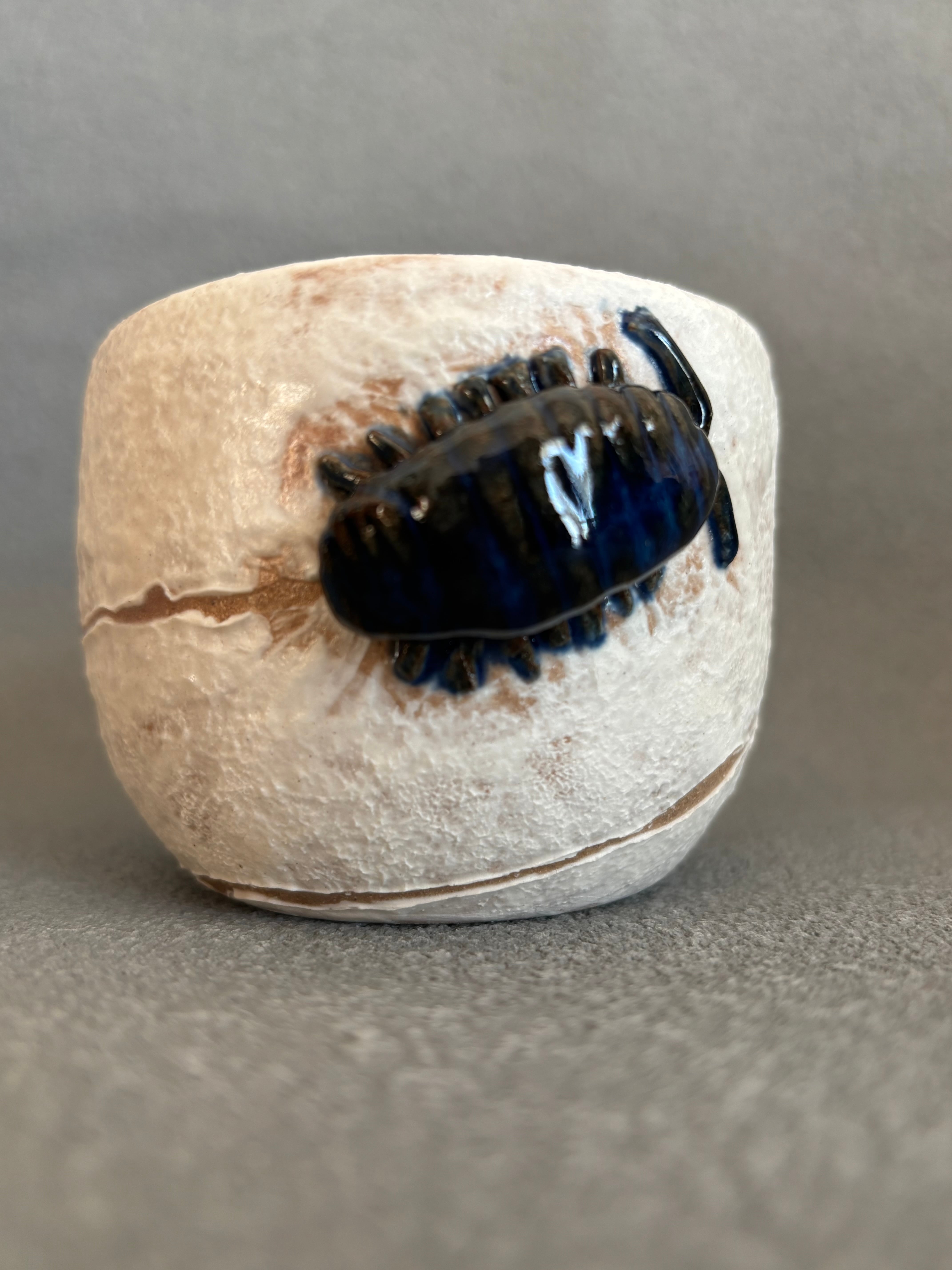 生き物シリーズ虫のダンゴムシモチーフのぐい呑み、フリーカップです。ダンゴムシの這った跡と、瑠璃色のダンゴムシが虫好きの方にはたまらないデザインで、日常のコーヒータイム、お酒の時間を楽しんで下さい。
