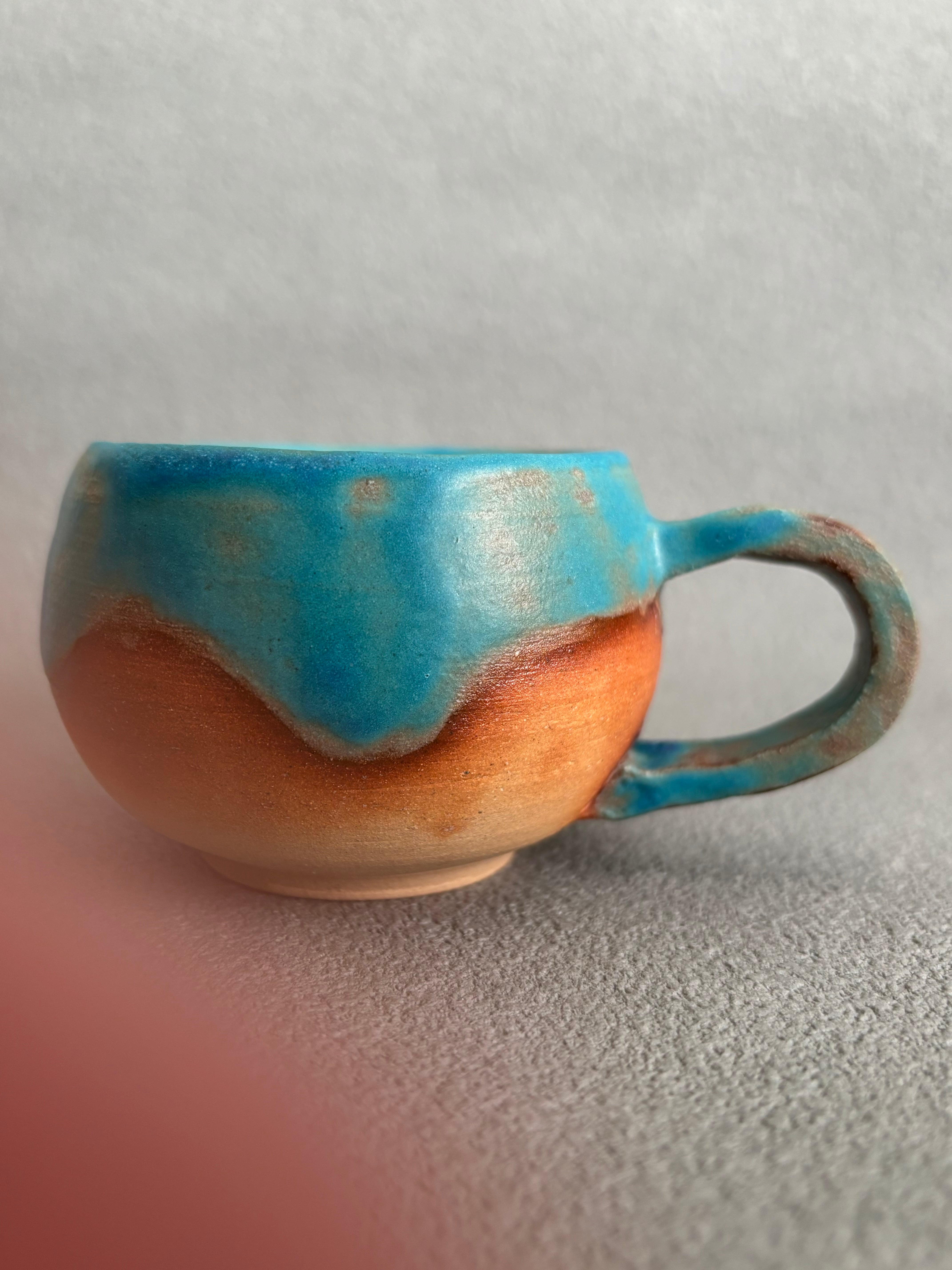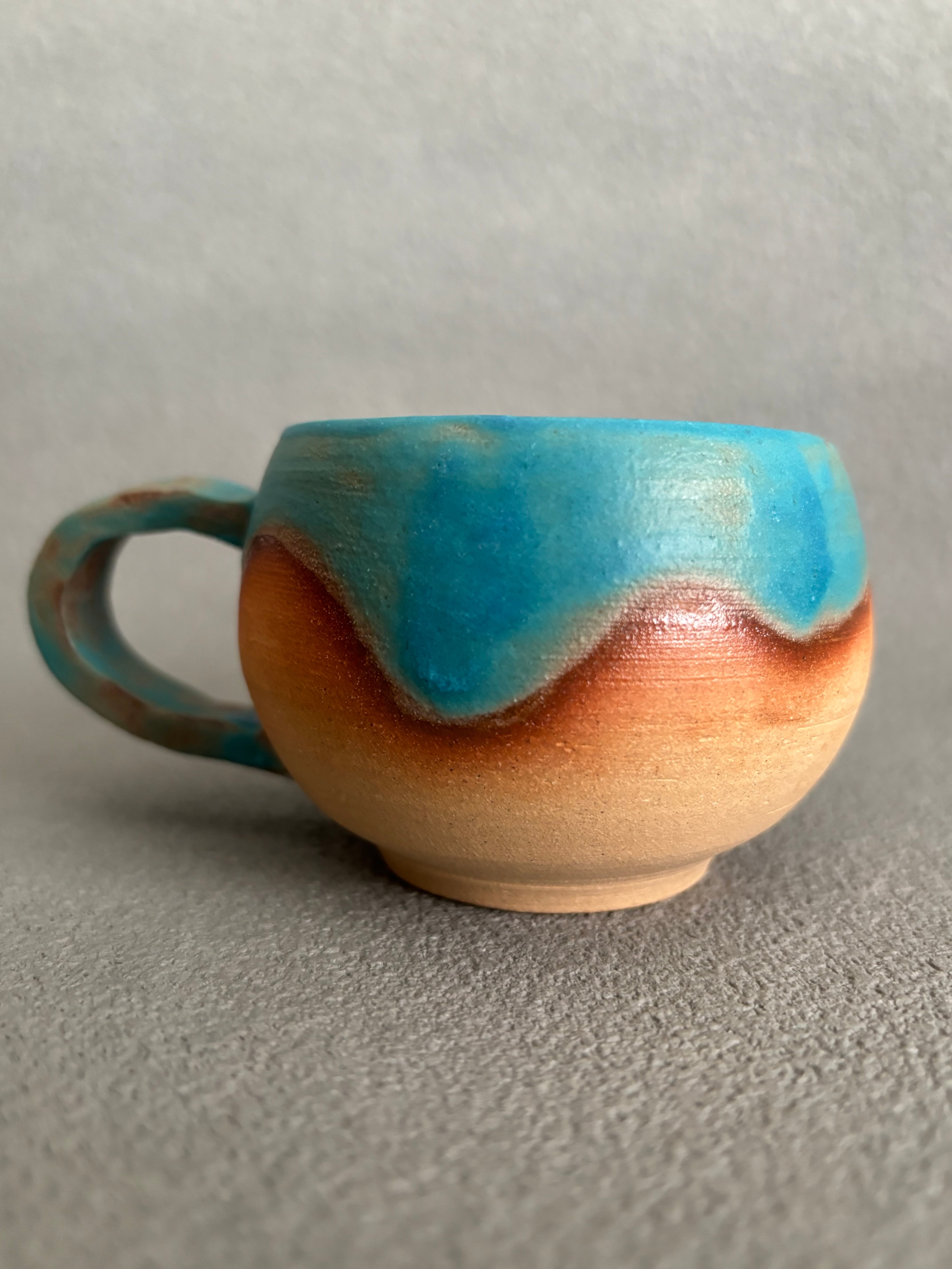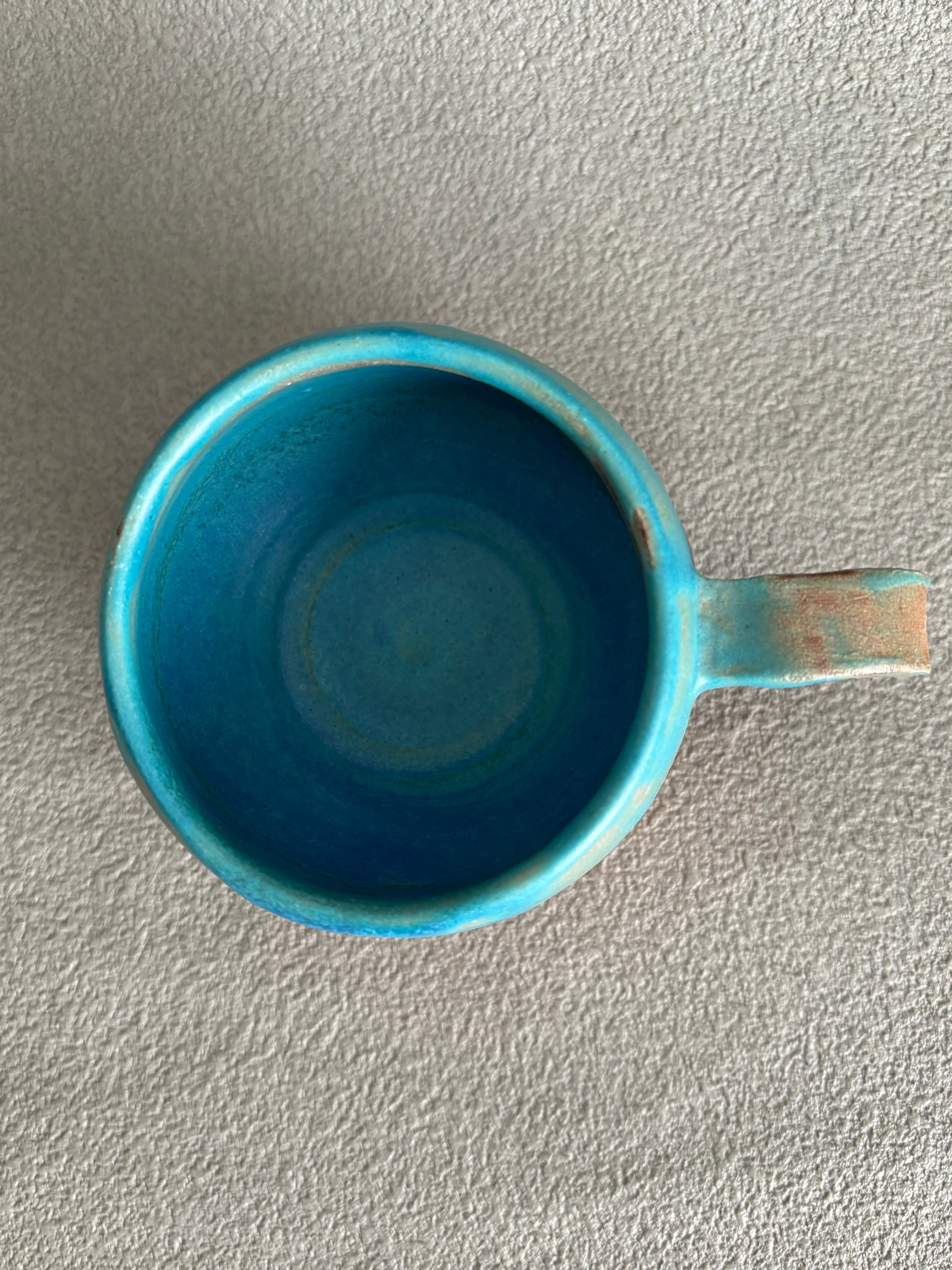 ハワイアンブルーの色合いの小ぶりな丸い形状のコーヒーカップです。青の釉薬垂れのデザインがハワイの青い海の波や海辺の心地よい風景感じさせます。エスプレッソ等のコーヒーカップとして最適で、毎日のコーヒータイムを特別なひとときにしてくれます。