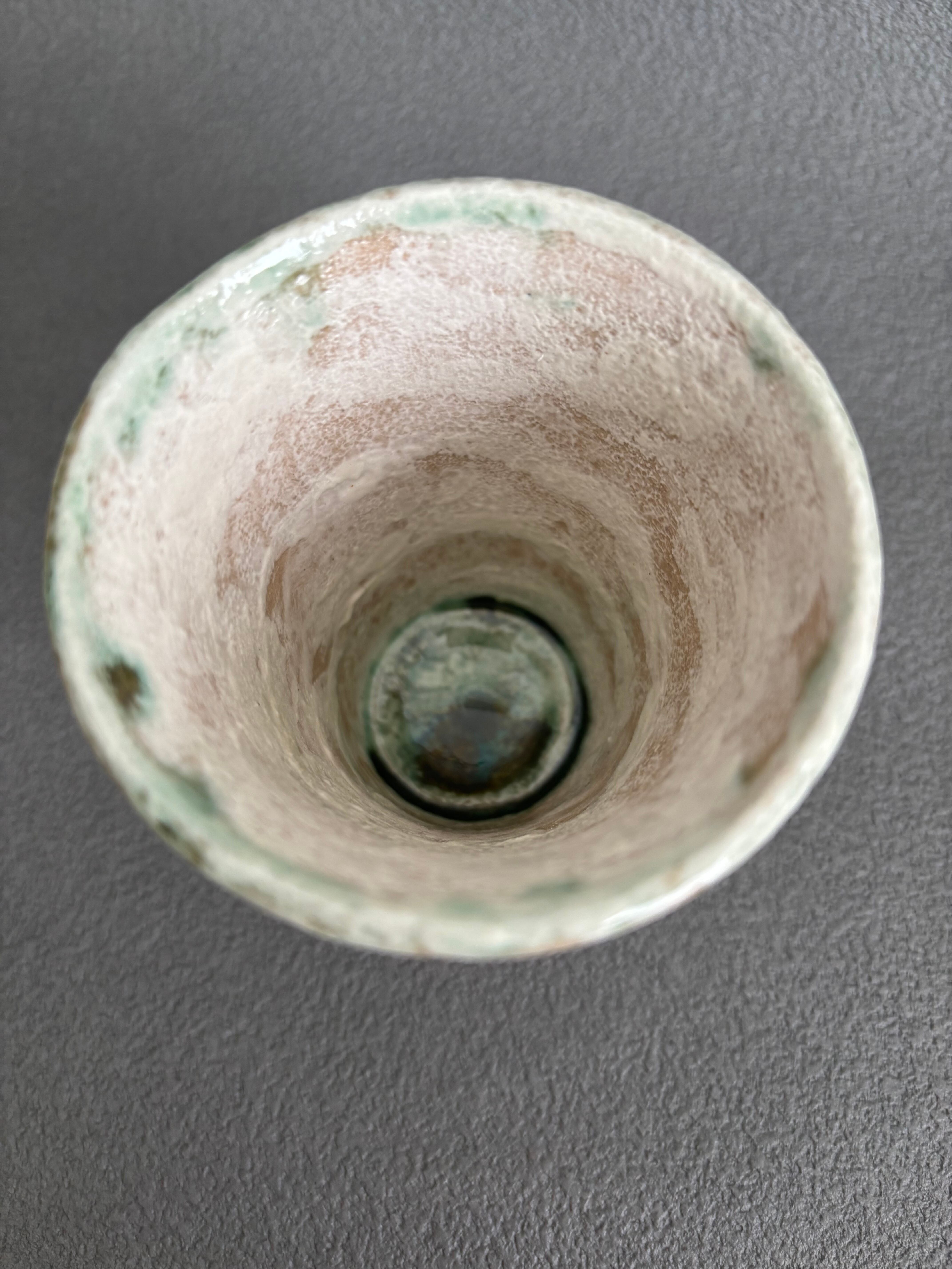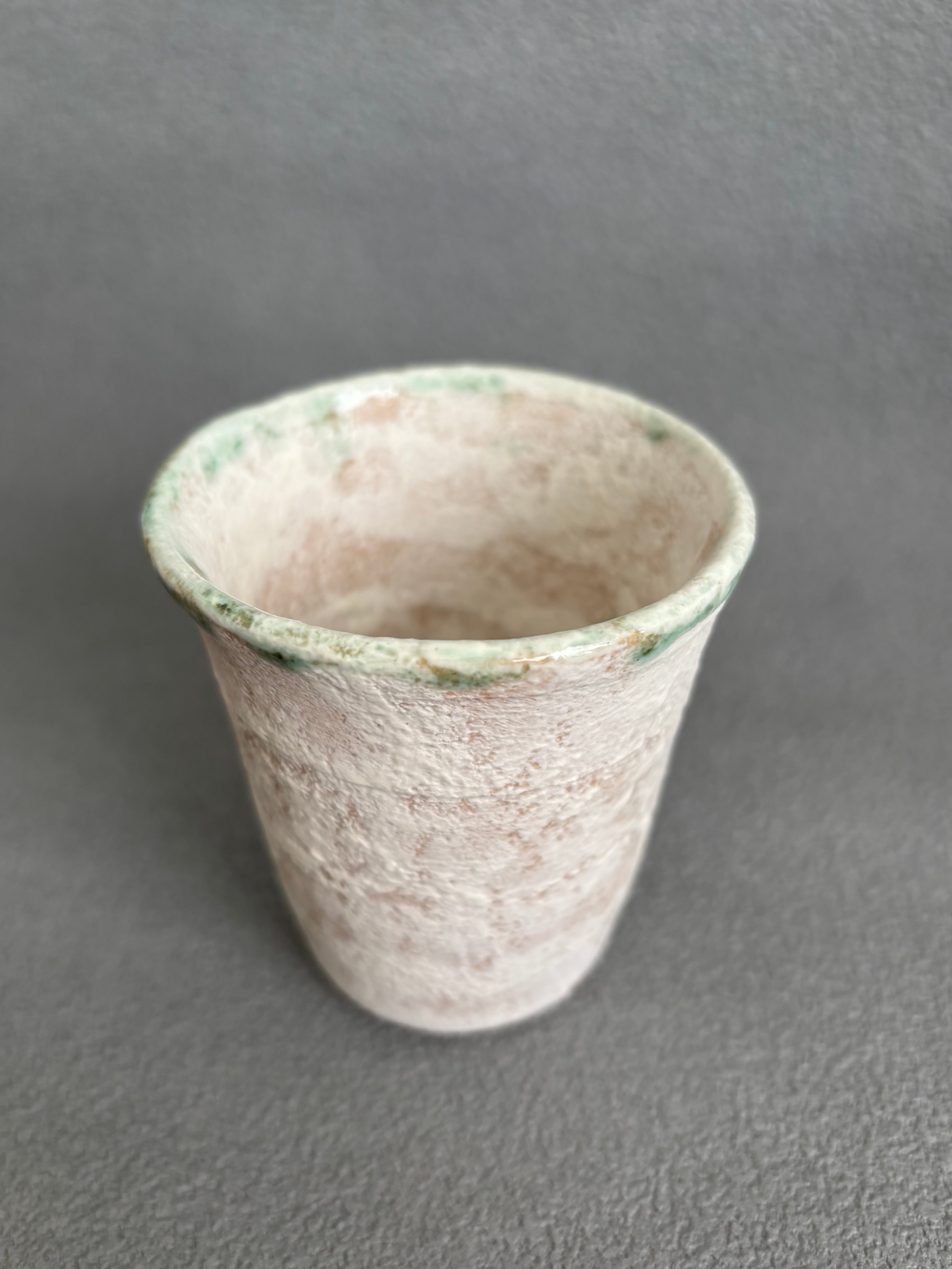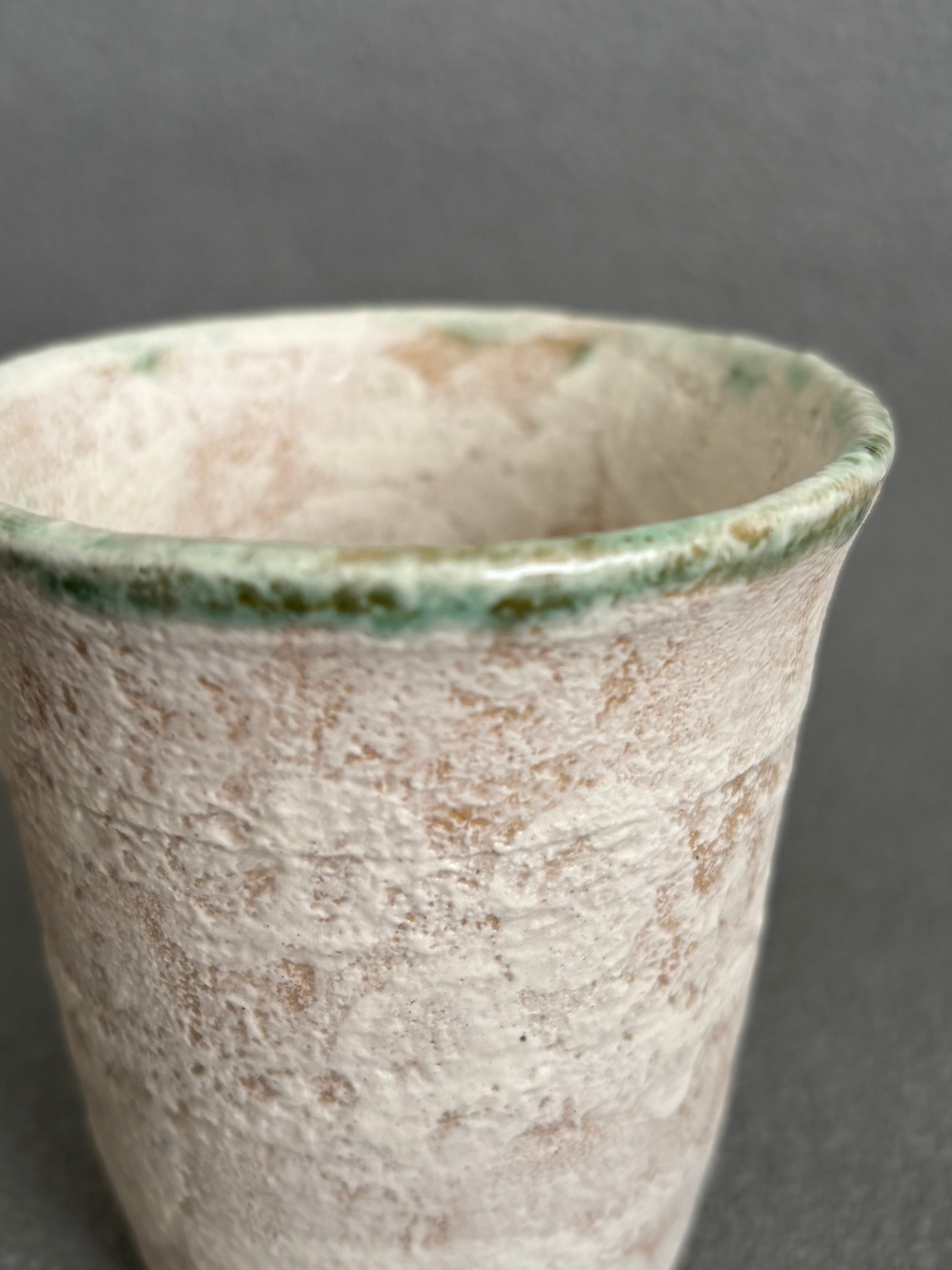 白い砂浜をテーマにした白化粧と口元と底にエメラルドグリーンの釉薬が特徴のフリーカップ、ぐい呑みです。使ううちに色が変わって自分色に染まるのも趣きがあります。毎日のコーヒータイムやワインや日本酒のお酒の時間を特別なひとときにしてくれます。