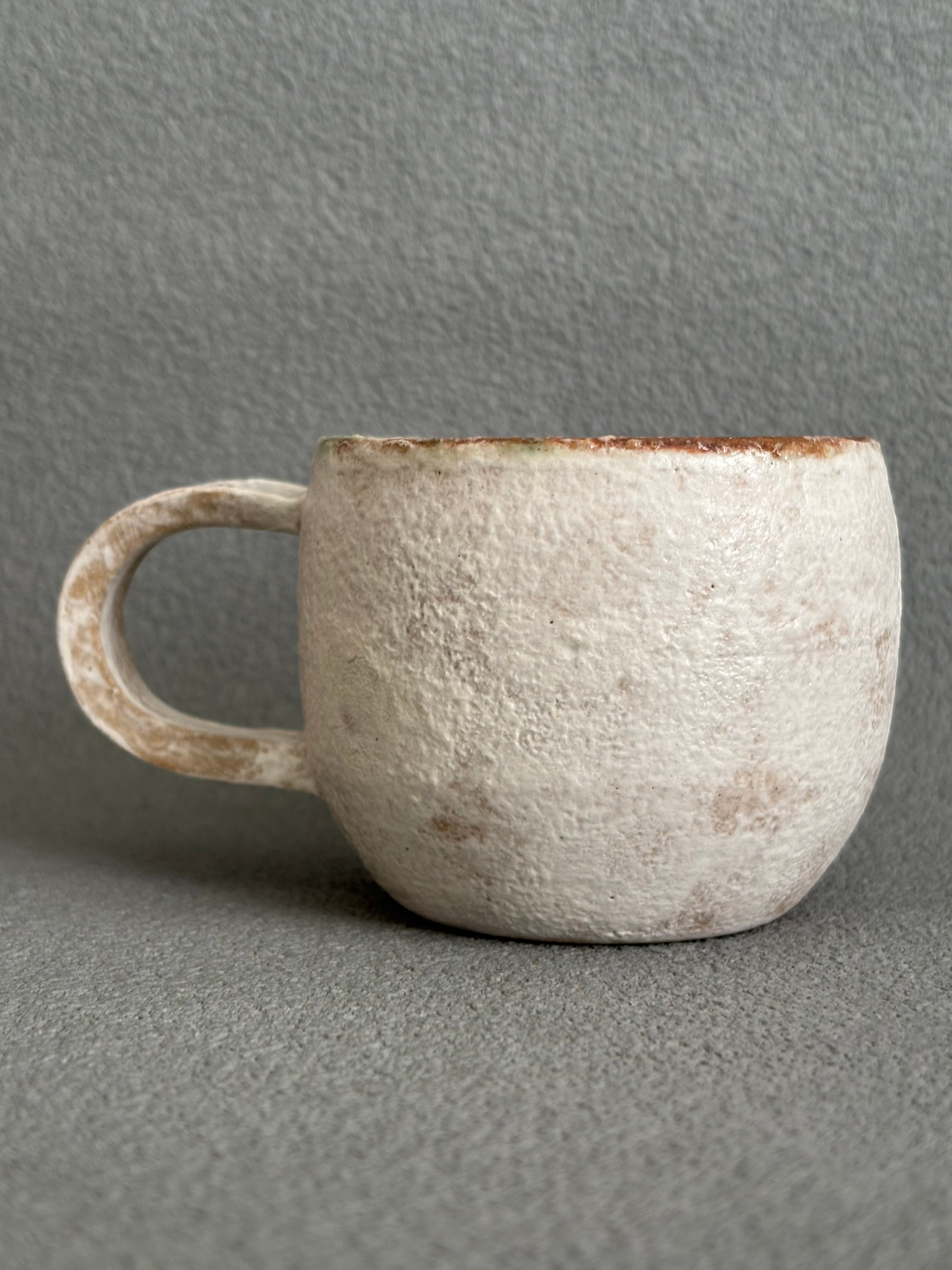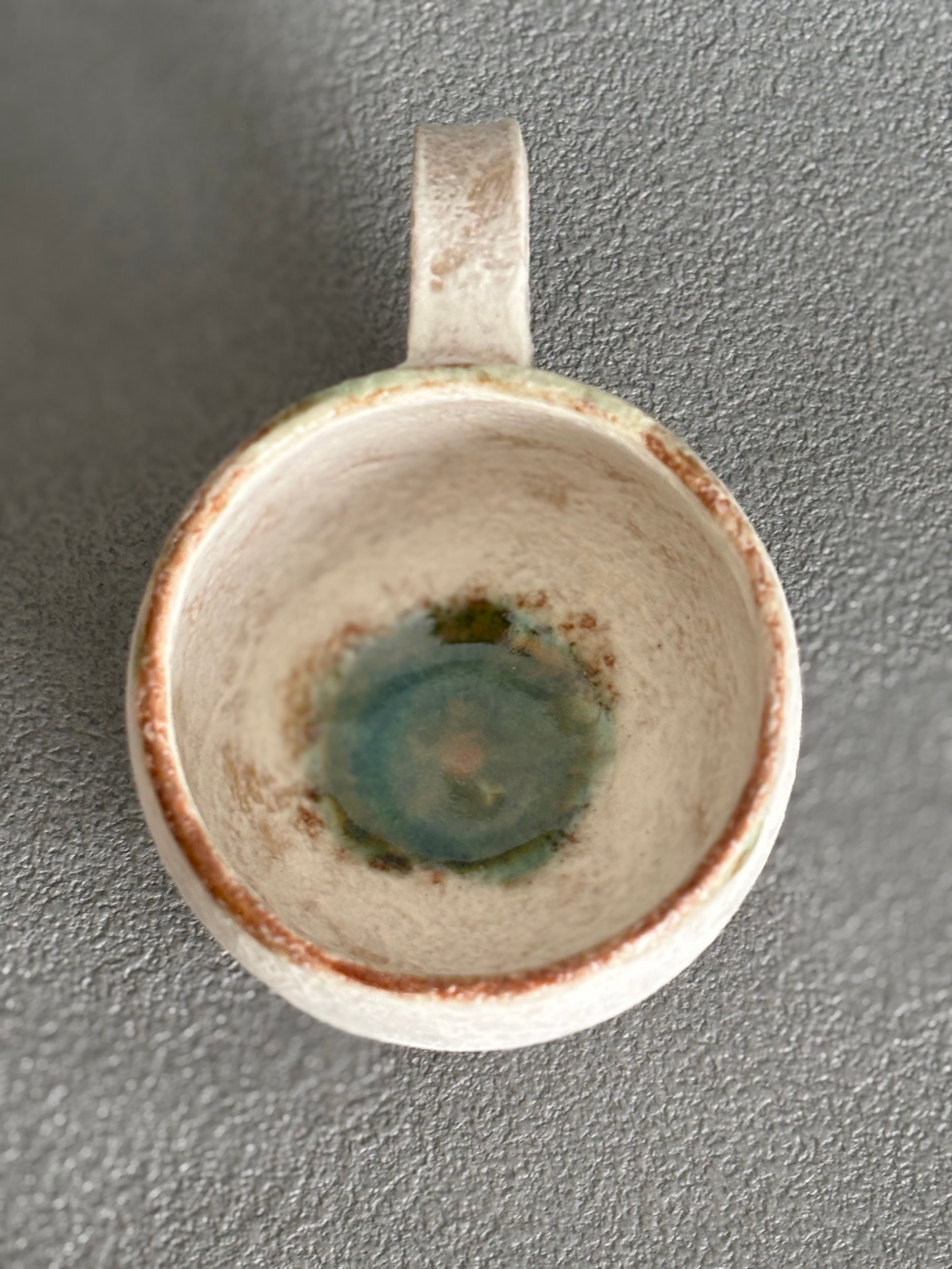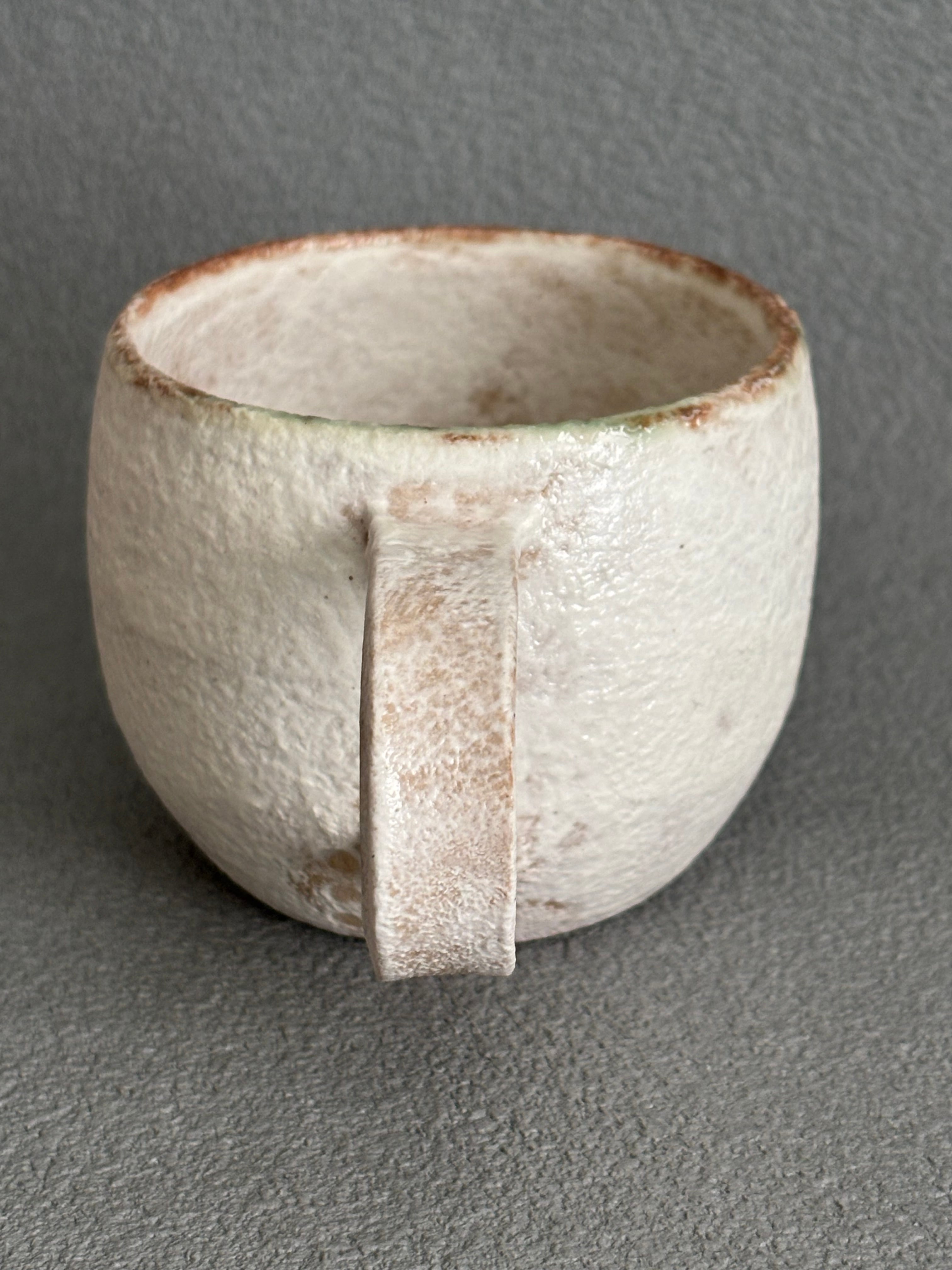 白い砂浜をテーマにした白化粧と底に溜まったエメラルドグリーンの釉薬が特徴のきれいな丸いフォルムの可愛いコーヒーカップです。毎日のコーヒータイムを特別なひとときにしてくれます。