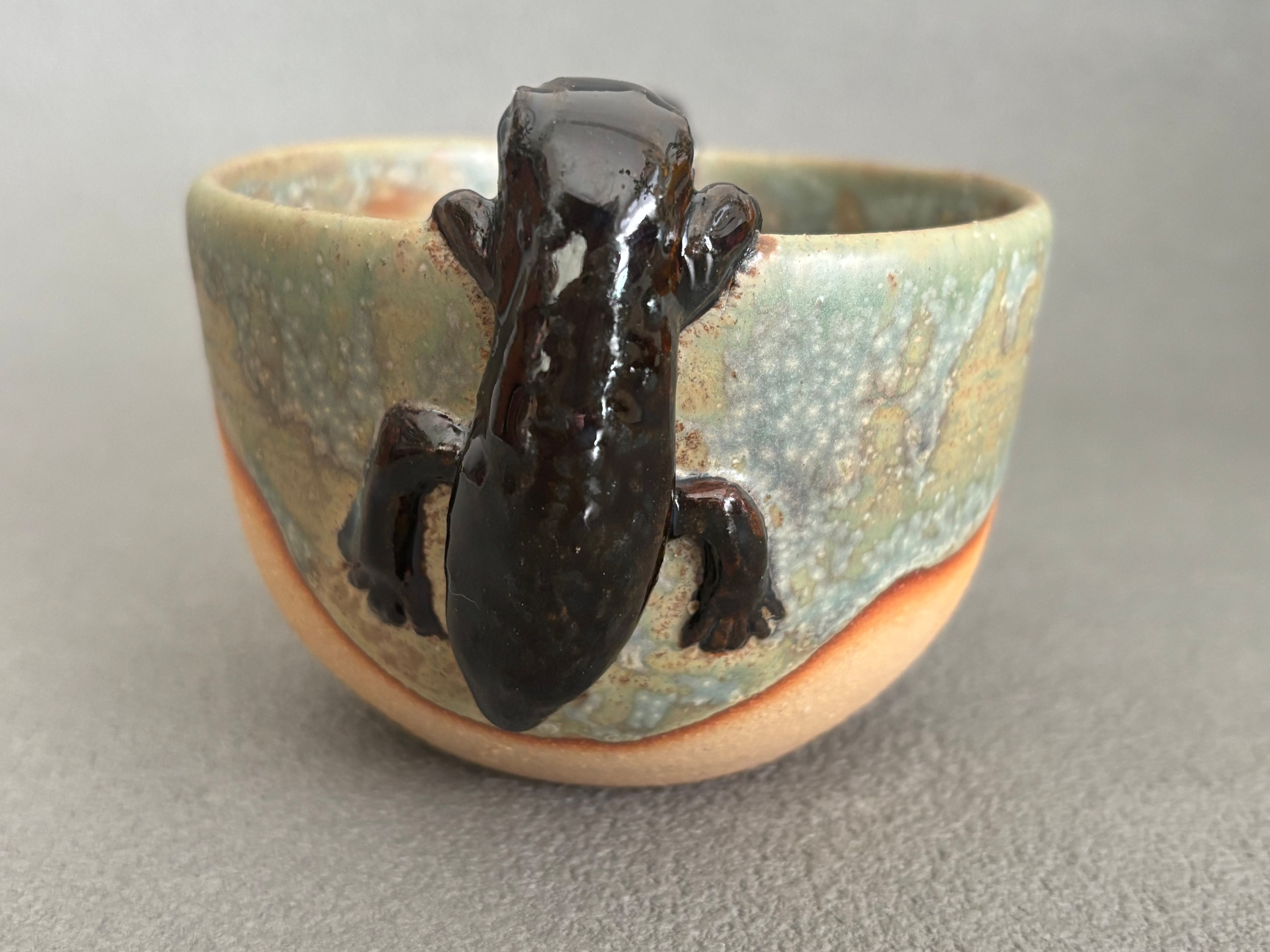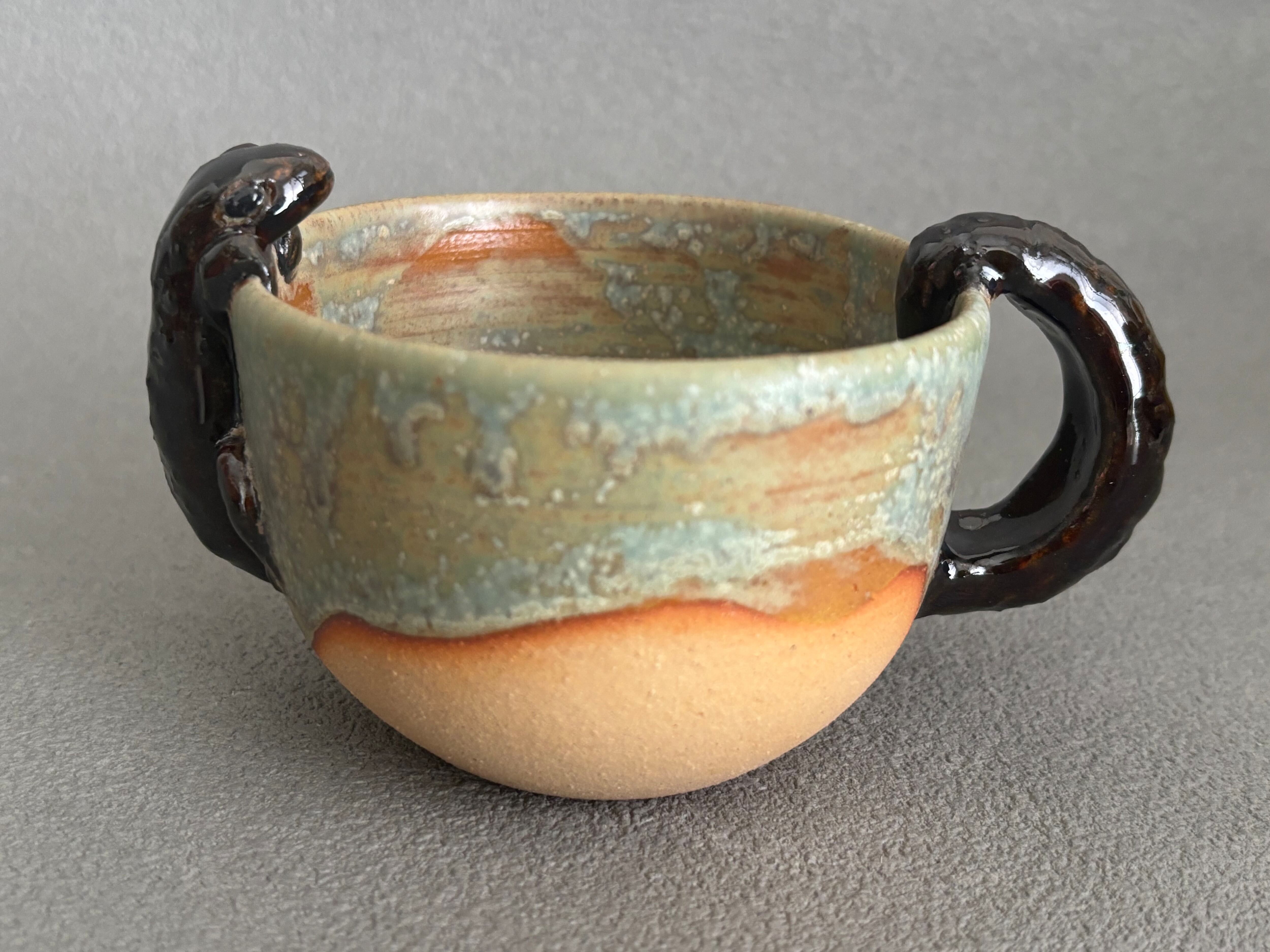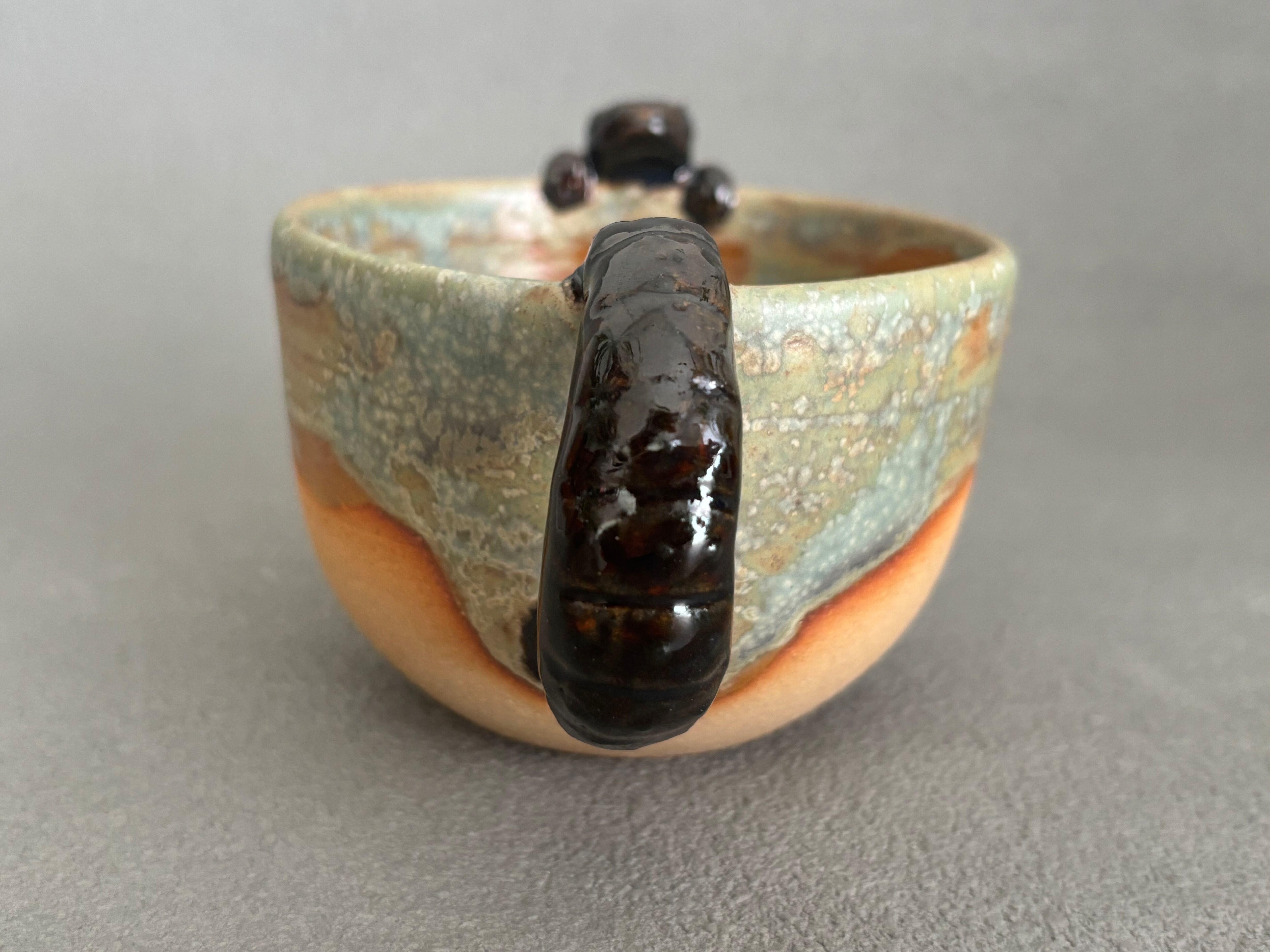 生き物シリーズのヒョウモントカゲモドキ ブラックナイトモチーフのコーヒーカップです。エメラルドグリーンの釉薬に、ブラックレオパの尻尾が取っ手になったレオパ好きの方にはたまらないデザインで、日常のコーヒータイムを楽しんで下さい。限定1個です。