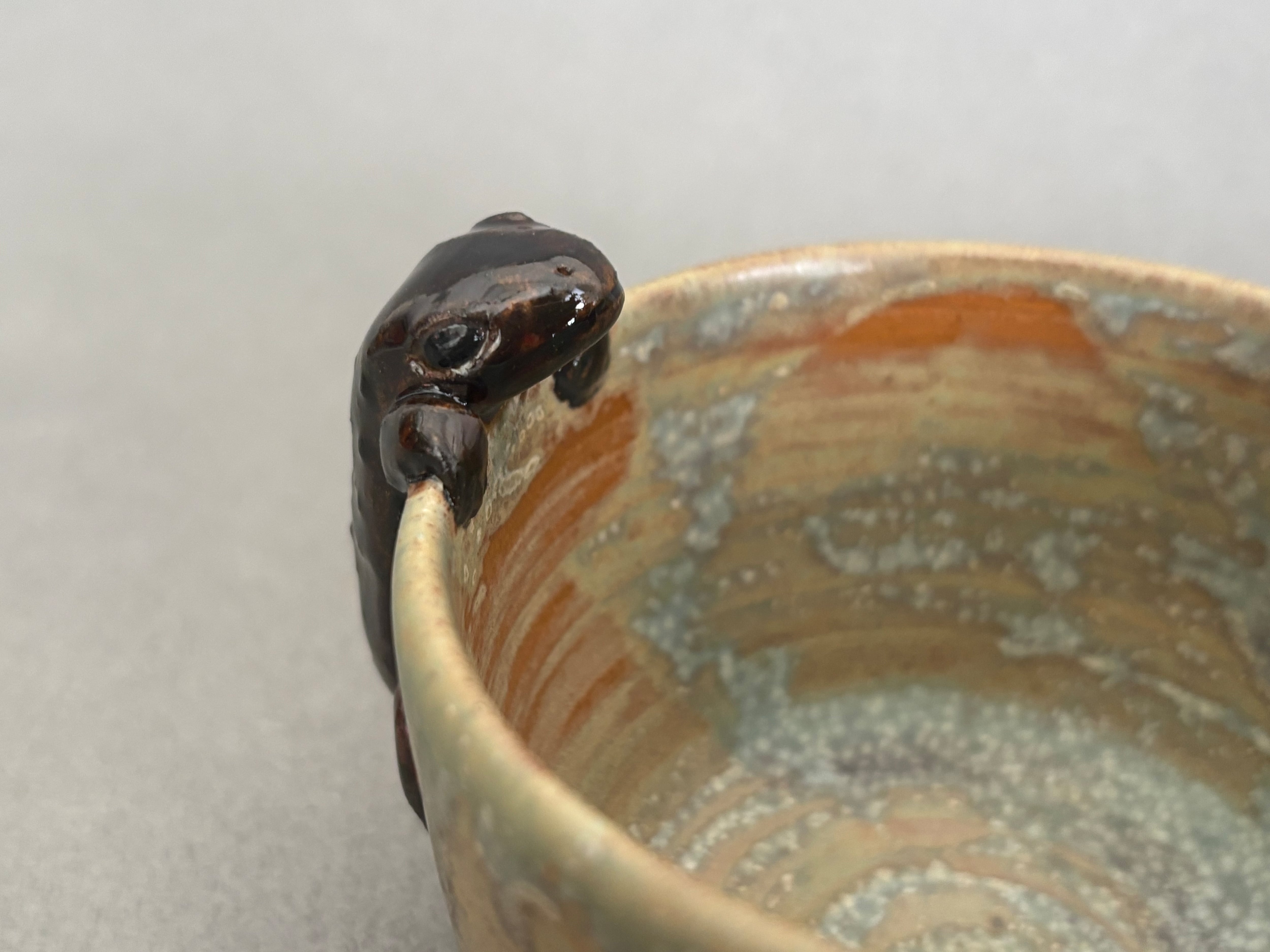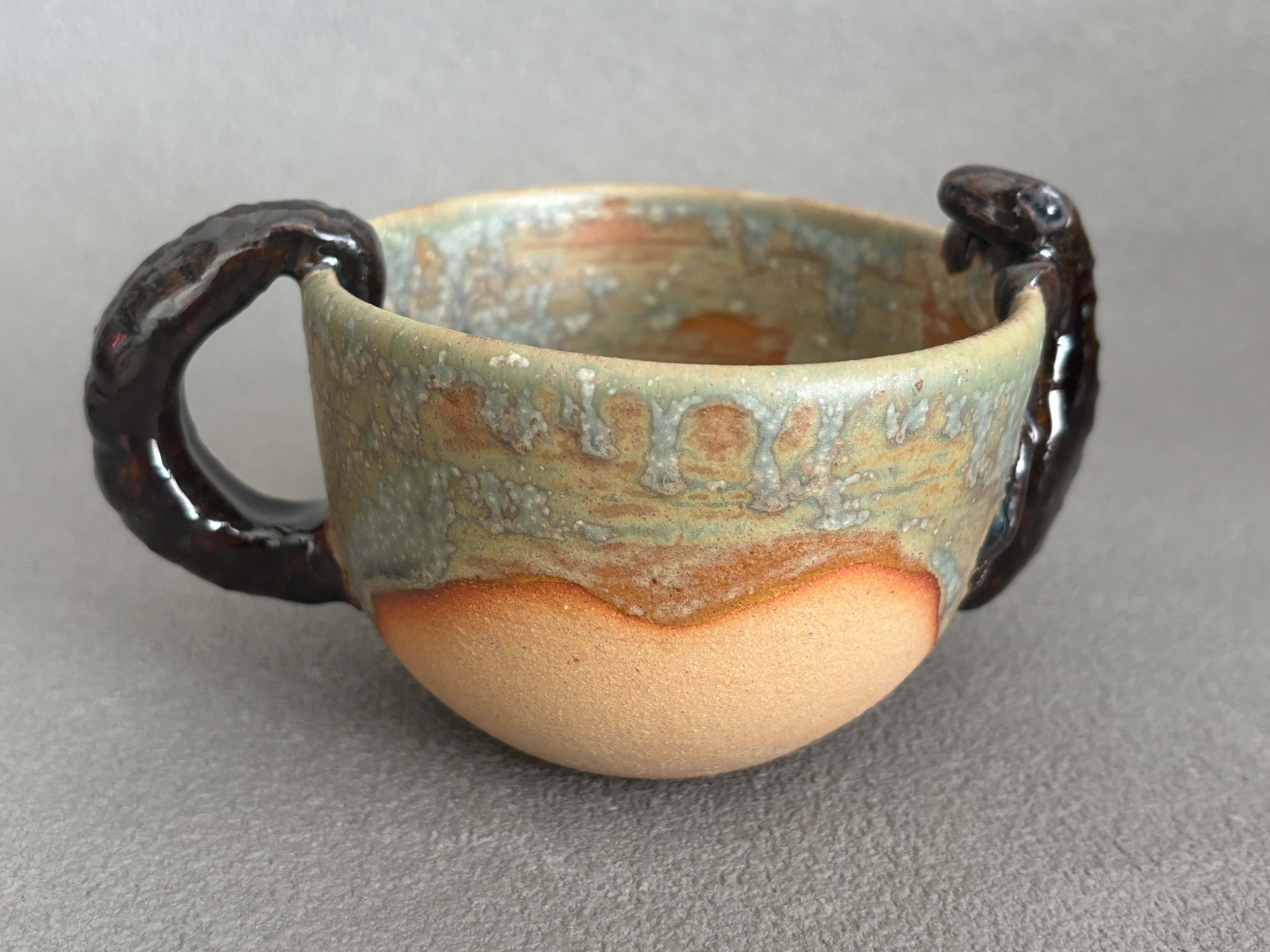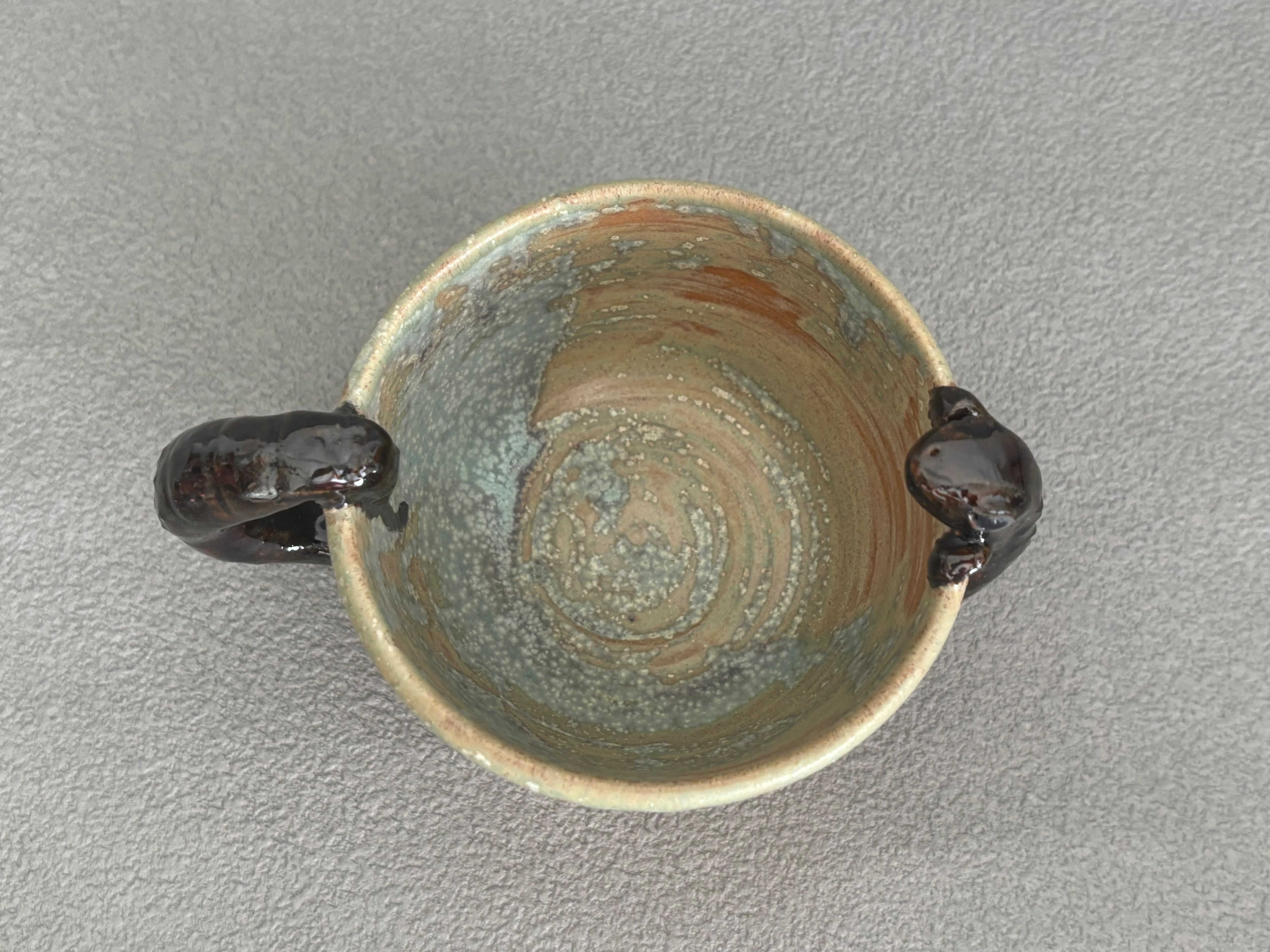 生き物シリーズのヒョウモントカゲモドキ ブラックナイトモチーフのコーヒーカップです。エメラルドグリーンの釉薬に、ブラックレオパの尻尾が取っ手になったレオパ好きの方にはたまらないデザインで、日常のコーヒータイムを楽しんで下さい。限定1個です。