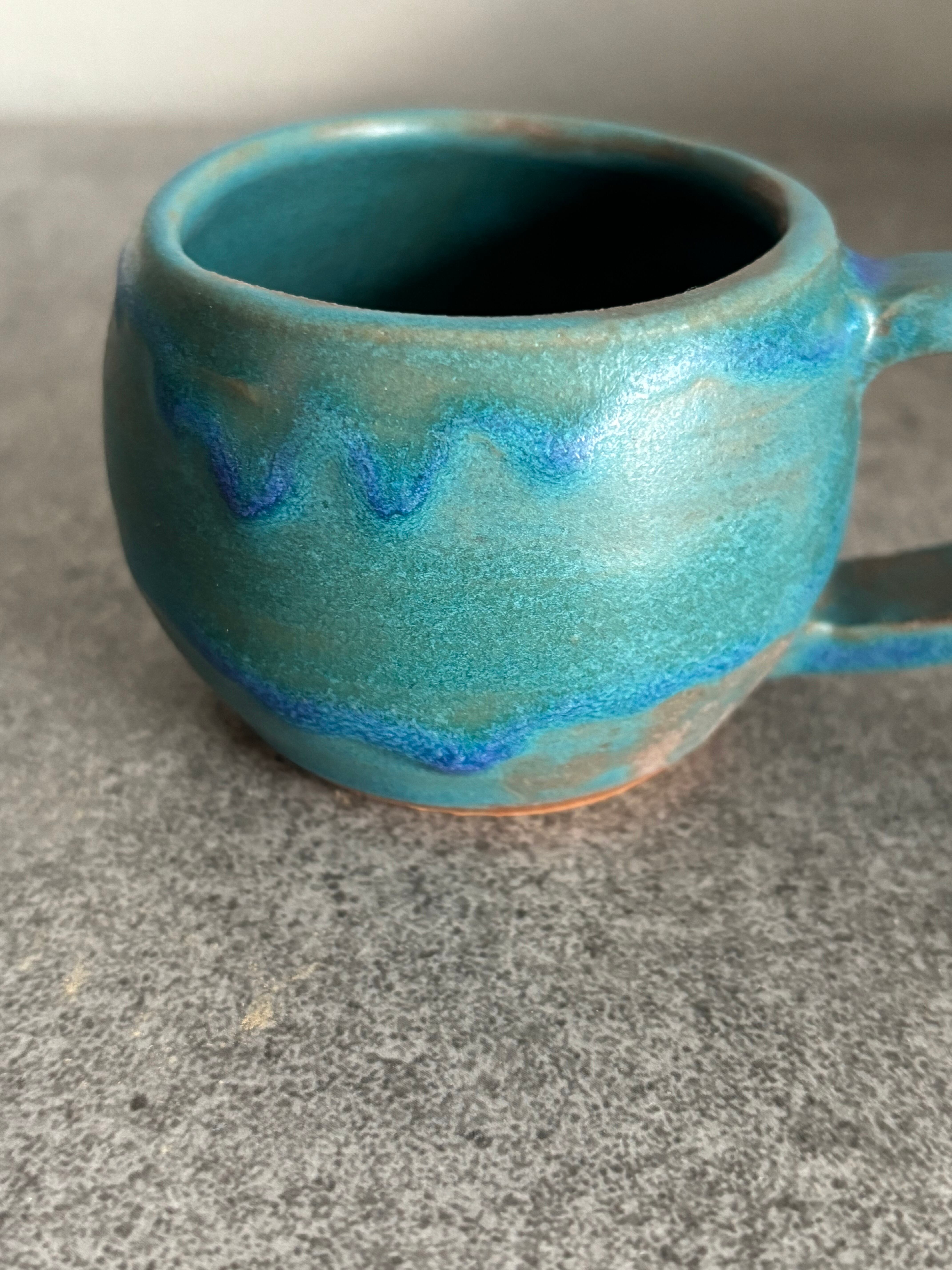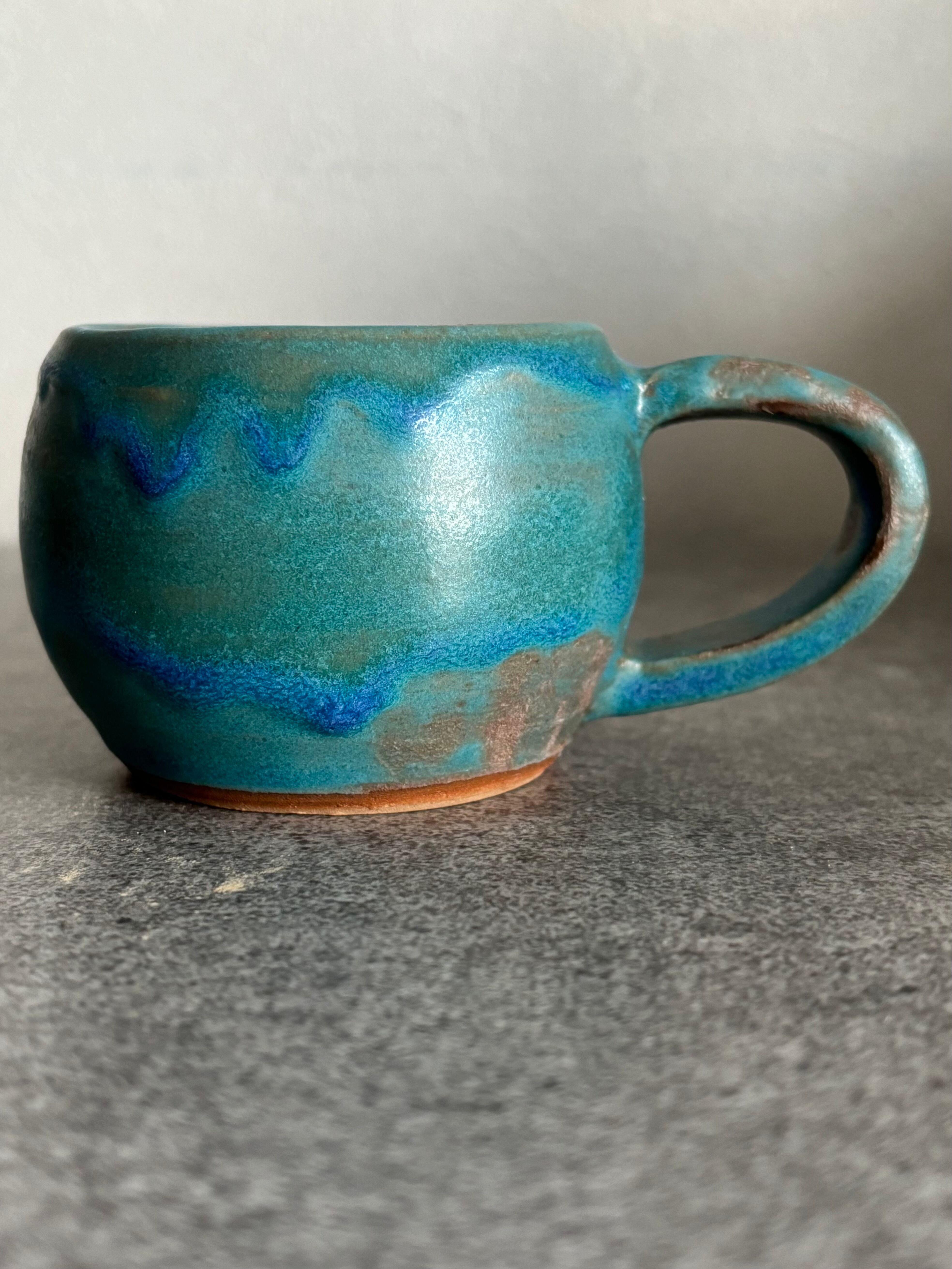 ハワイアンブルーの色合いの小ぶりな丸い形状のコーヒーカップです。青の釉薬垂れのデザインがハワイの青い海の波や海辺の心地よい風景感じさせます。エスプレッソ等のデミタスカップとして最適で、毎日のコーヒータイムを特別なひとときにしてくれます。